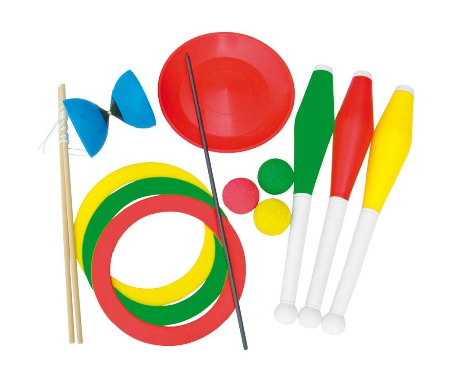 - 11 onderdelen: ballen, kegels, ringen, bord met stok, diabolo