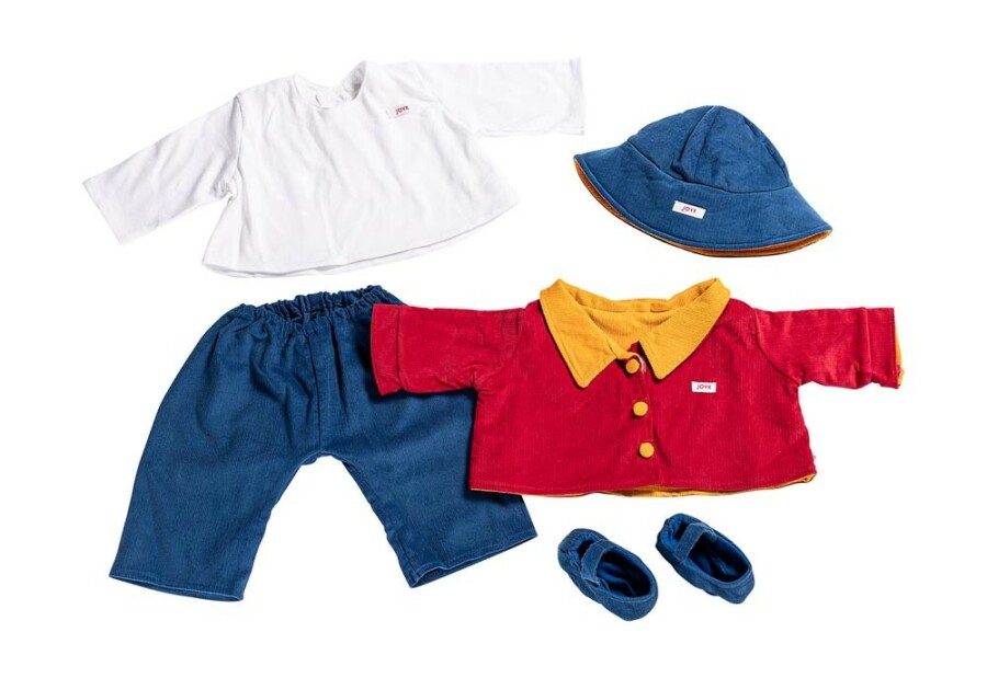 Complete kleding voor buitenweer, ontworpen voor JOYK poppen. De broek heeft elastiek en de drukknopen zijn eenvoudig te bedienen. De omkeerbare hoed maakt het setje af. Helpt kinderen zelfredzaamheid te oefenen tijdens rollenspel.