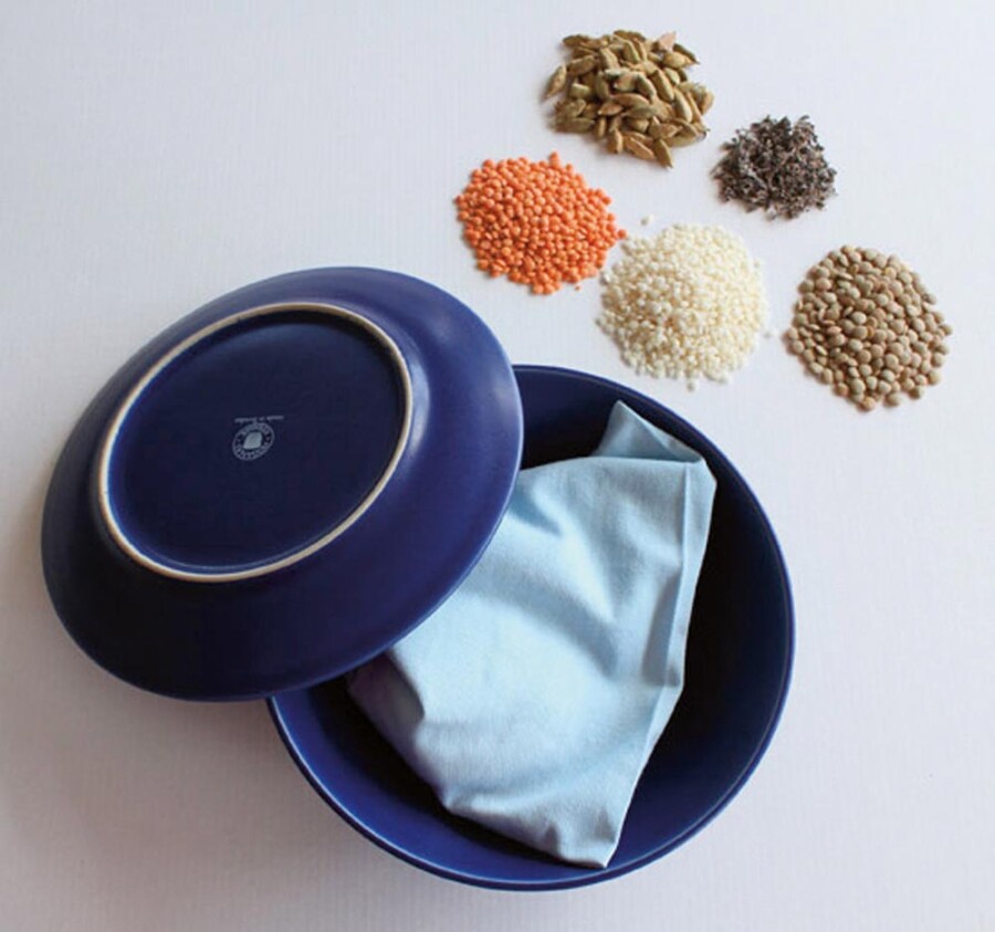 - Verwarmen: blauw zakje kort in de magnetron, dan in de buik plaatsen
