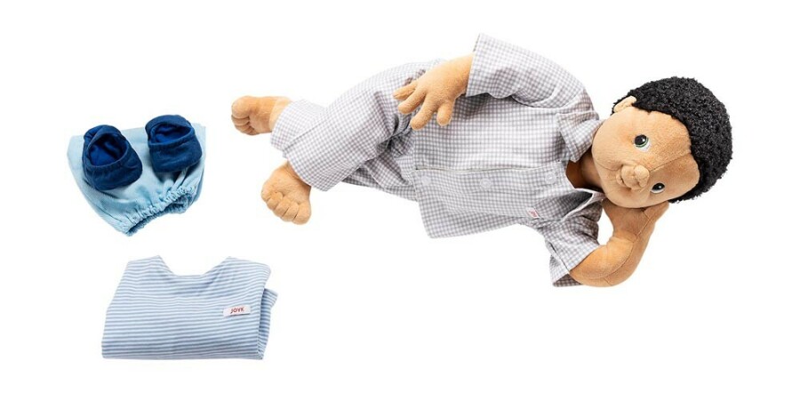 Empathiepop Antonio komt met extra kleding en is makkelijk aan te kleden. Kleine handen krijgen dit vlot voor elkaar. De pop voelt zacht door de stretchstof en nodigt uit tot gesprek. De katoenen kleding kan in de was tot dertig graden.