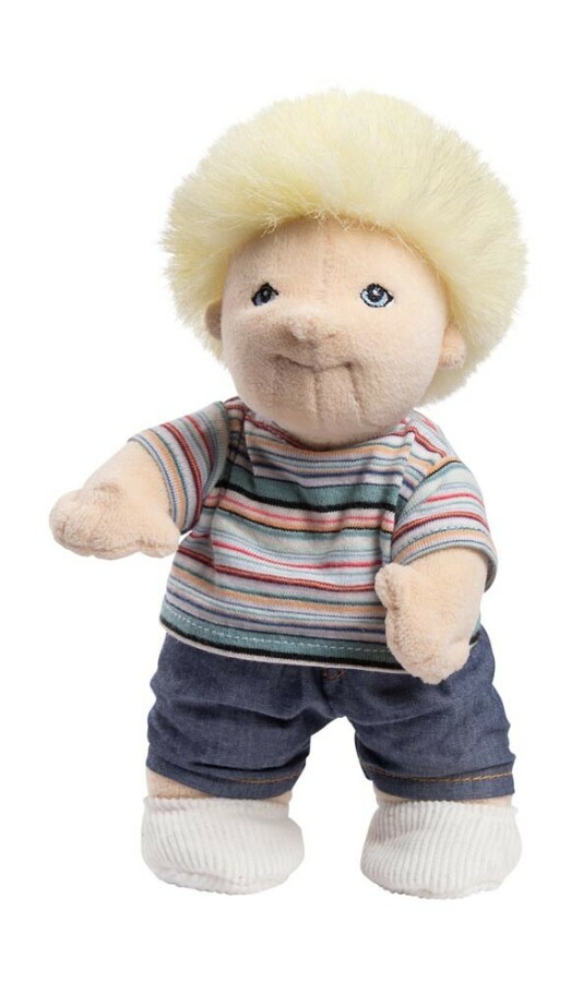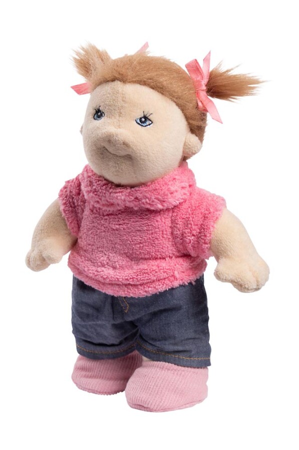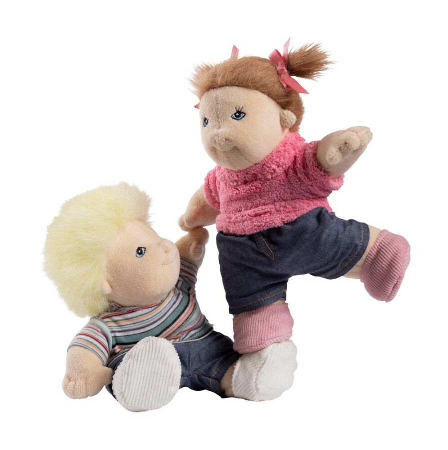 Twee zussen voor rollenspel in groep en thuis. Dankzij het buigzame draadframe bewegen armen en benen natuurlijk mee. Hun kleding en schoenen kunnen aan en uit, wat zelfstandigheid spelenderwijs oefent. Het zachte lichaam voelt prettig aan en past goed in een poppenhuis. Lichaam van huidvriendelijke stretchstof, kleding van katoen en handwasbaar.