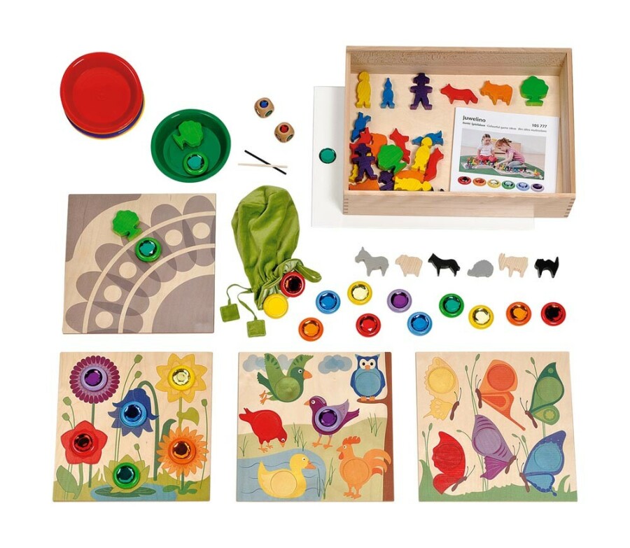 Hiermee spelen peuters en kleuters met kleur, stapelen en patronen. De glanzende ‘juwelen’ trekken meteen aandacht. Meerdere spelvormen met oplopende uitdaging houden het lang interessant. Past in thematafels en kleine groepen. Verbindt spelenderwijs esthetiek, tellen en kleurherkenning.