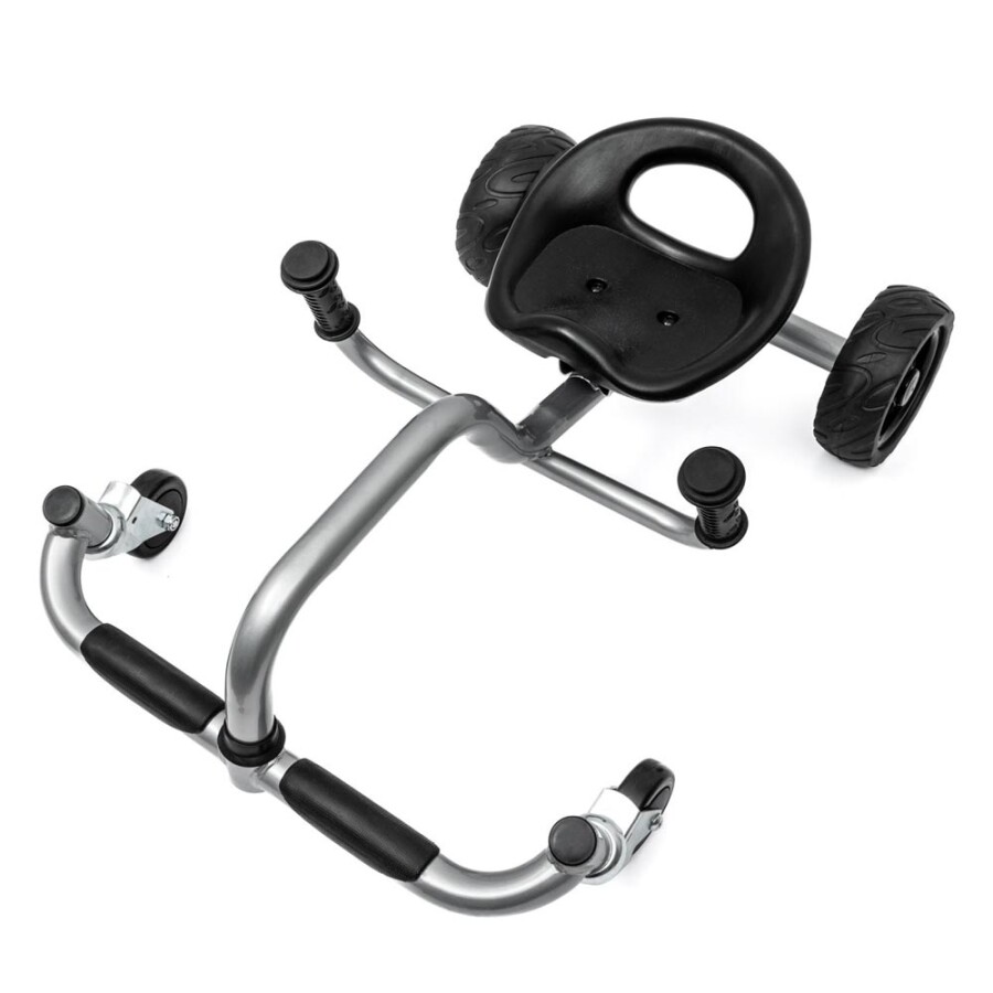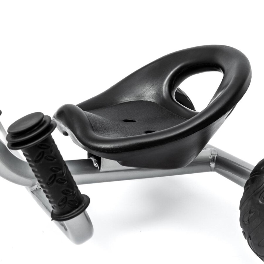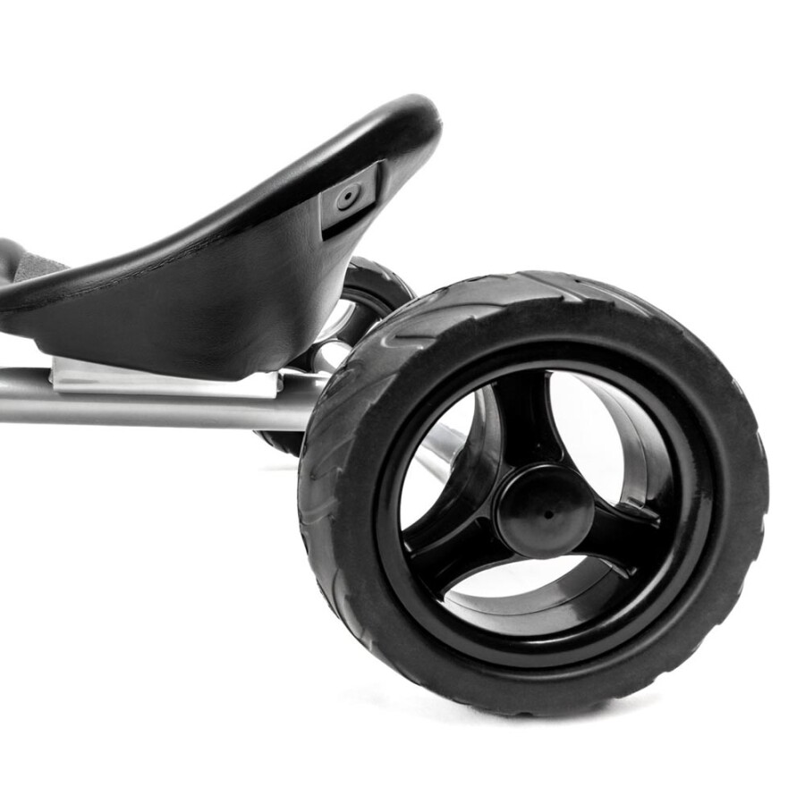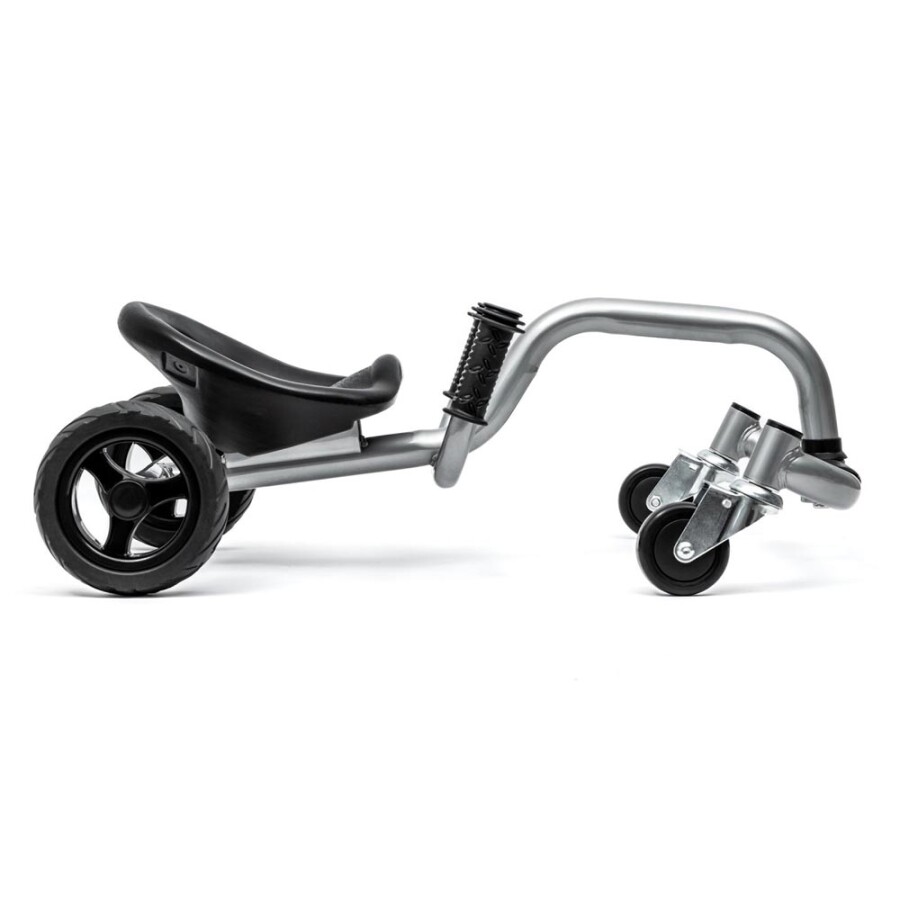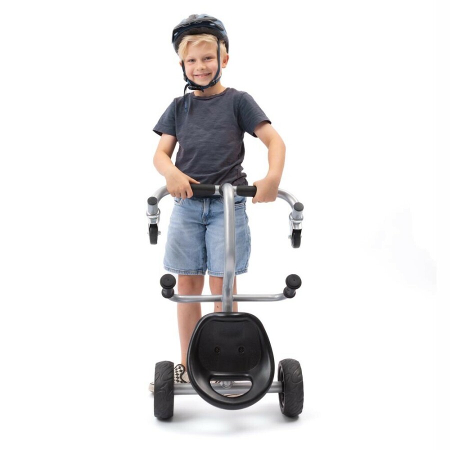 Stil en soepel rondrijden zonder herrie; rubberen wielen glijden binnen en buiten. Kind zit stabiel in ergonomische kuip met 20 cm zithoogte. Antislip voetvlakken en stevige handgrepen geven vertrouwen bij sturen en remmen. Wendbare 360° zwenkwielen vooraan maken korte bochten en slaloms eenvoudig. De stoel is verstelbaar, het metalen frame is licht en sterk.