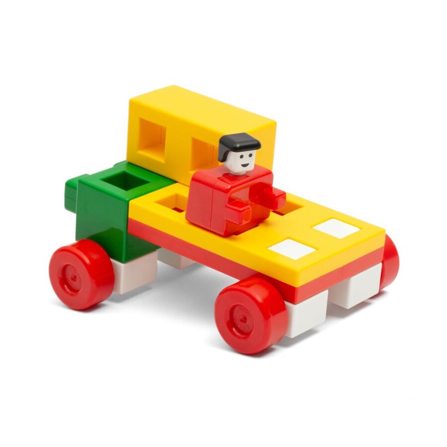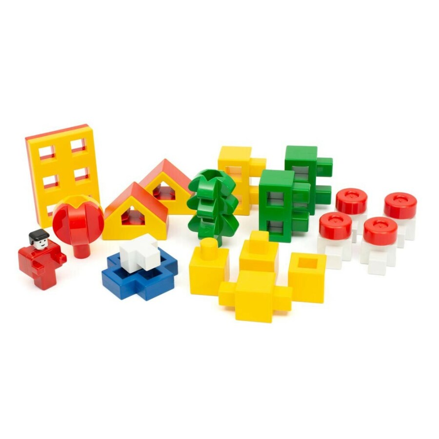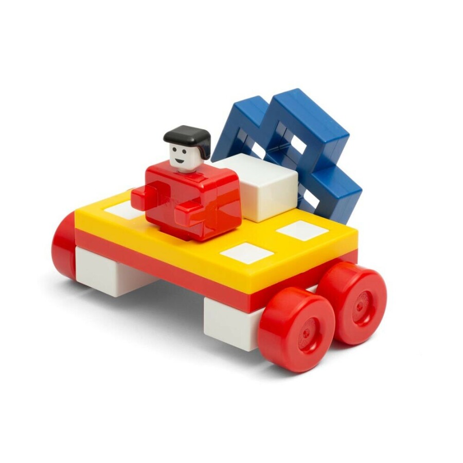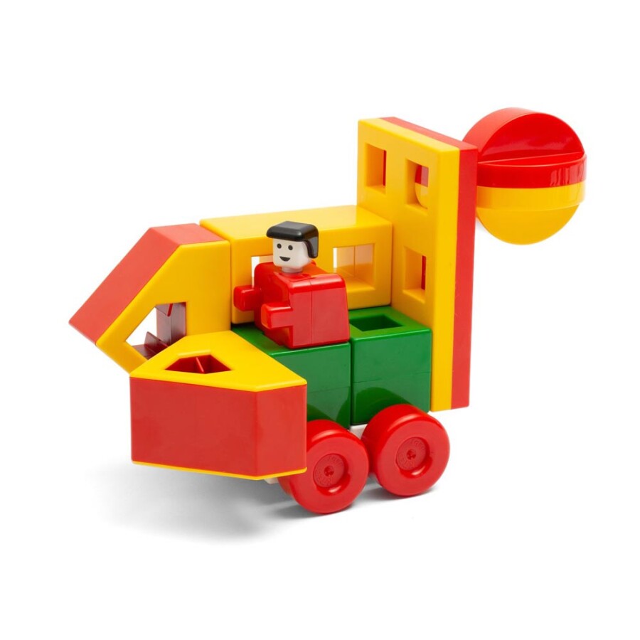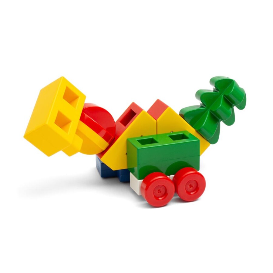 Grote, robuuste bouwstenen die kleine handen makkelijk pakken en in elkaar klikken. Al met twee blokken ontstaat iets dat rolt of draait, wat motiveert om door te bouwen. Heldere basiskleuren en enkele blokken met geluid prikkelen de zintuigen. Eenvoudige draai- en koppelpunten geven eerste mechanische ervaringen. Het ideeënboekje biedt inspiratie zonder te overprikkelen.