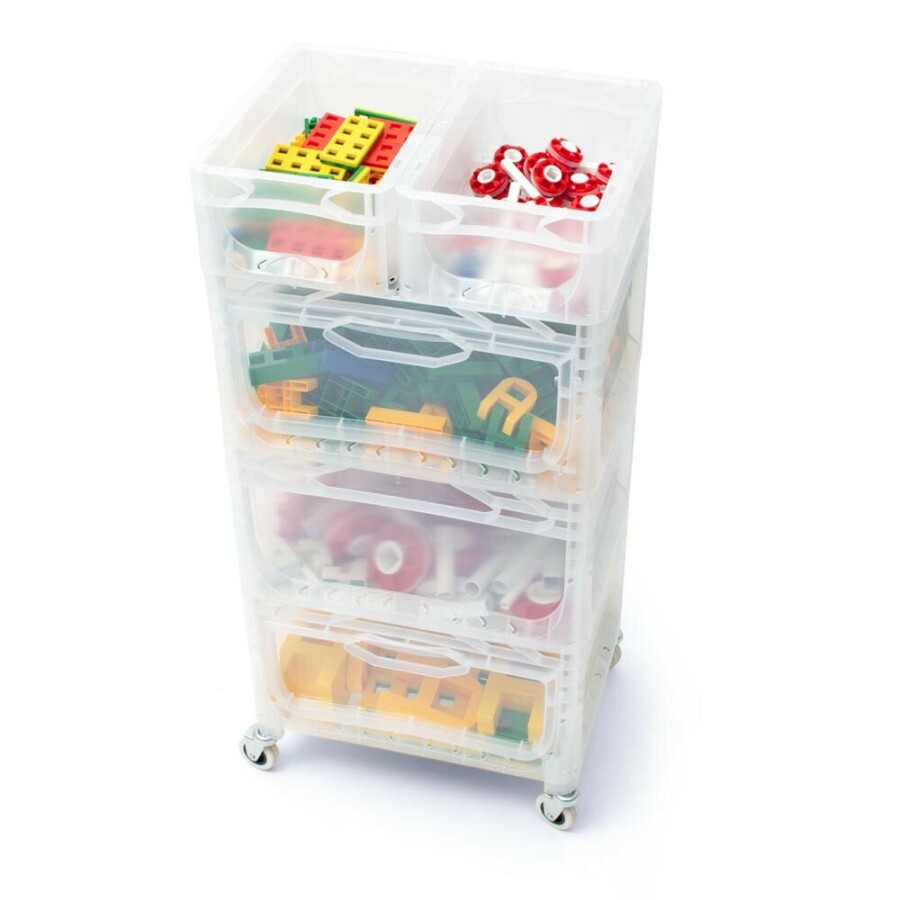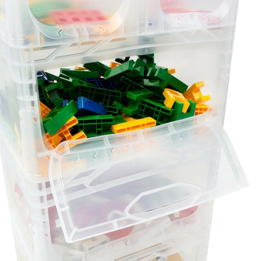 Een grote, complete basis voor creatief bouwen in groep of klas, inclusief verrijdbare opslag. De unieke klemverbinding laat in alle hoeken bouwen, ook schuine vormen. Meer dan honderd ideeën bieden structuur, terwijl kinderen ook eigen plannen uitvoeren. Samen bouwen stimuleert overleg en taakverdeling. De rolwagen houdt 431 onderdelen overzichtelijk en verplaatsbaar.