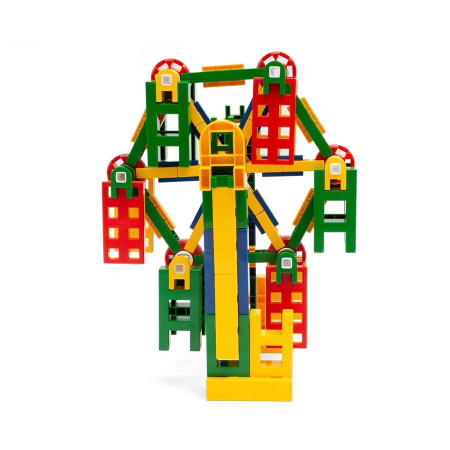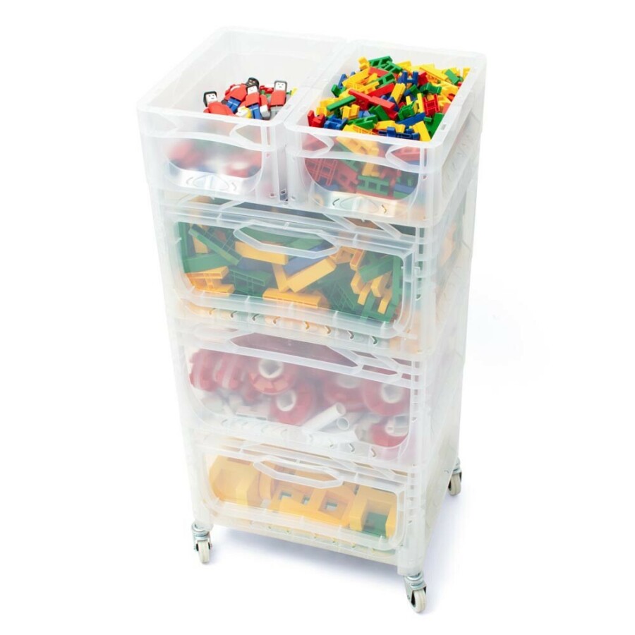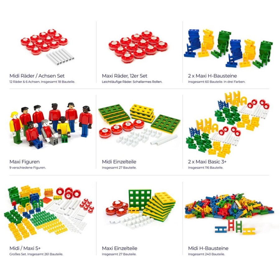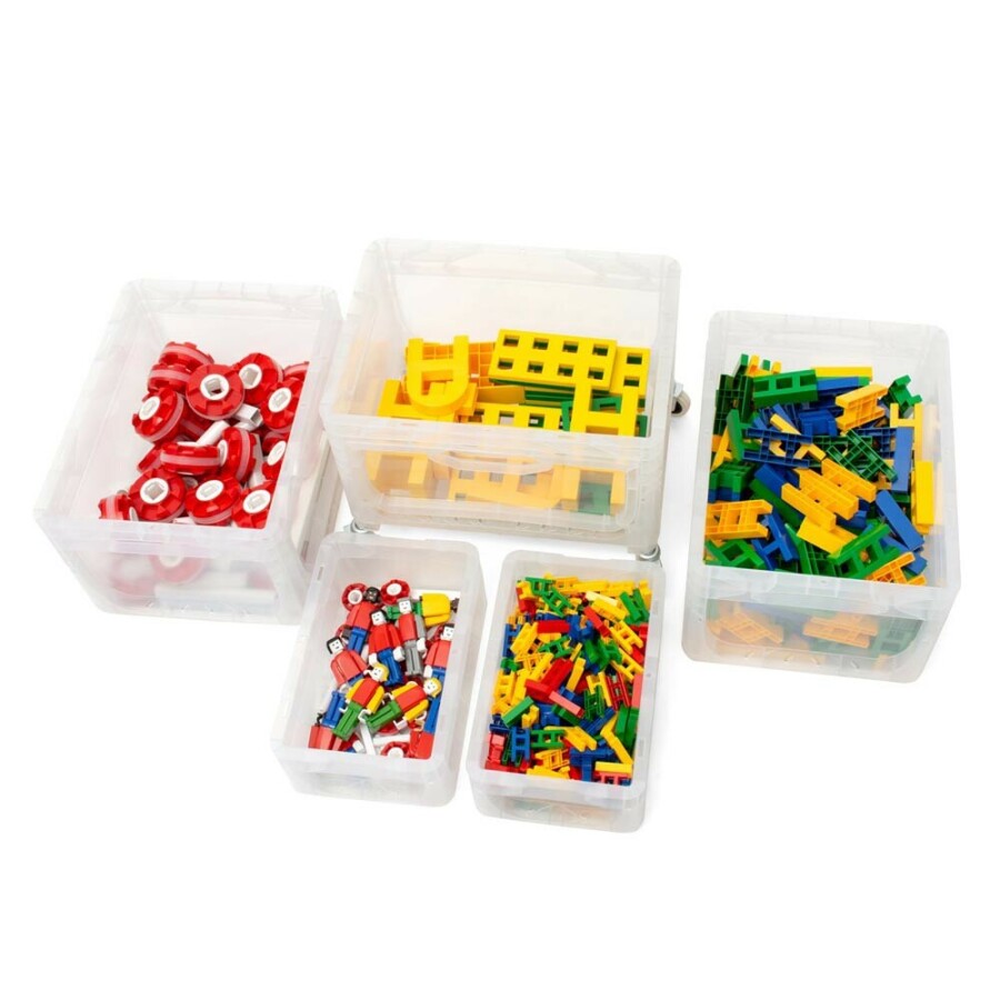 Dit is het grote pakket voor een hele klas die tegelijk wil bouwen. Kinderen bedenken samen plannen en zetten die om in bouwwerken met echte functies. De stenen klikken in alle hoeken, dus ook schuine constructies lukken snel. De rolwagen houdt alles overzichtelijk en klaar voor de volgende les. Het ideeënboek stimuleert zelfstandig starten en variëren.