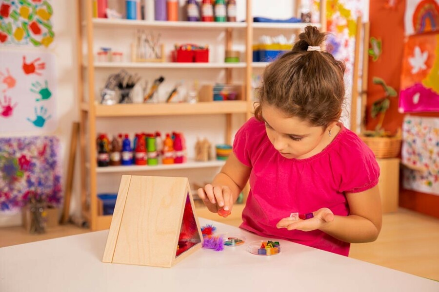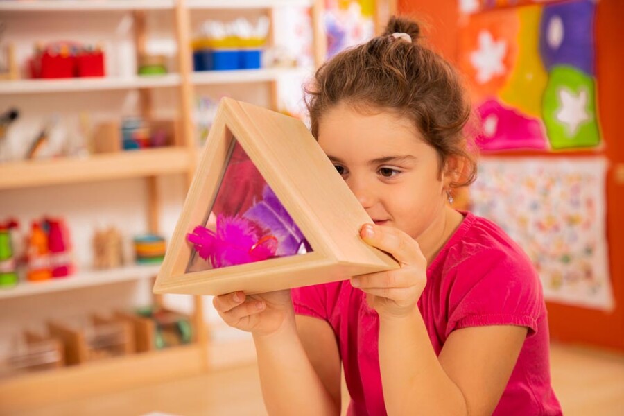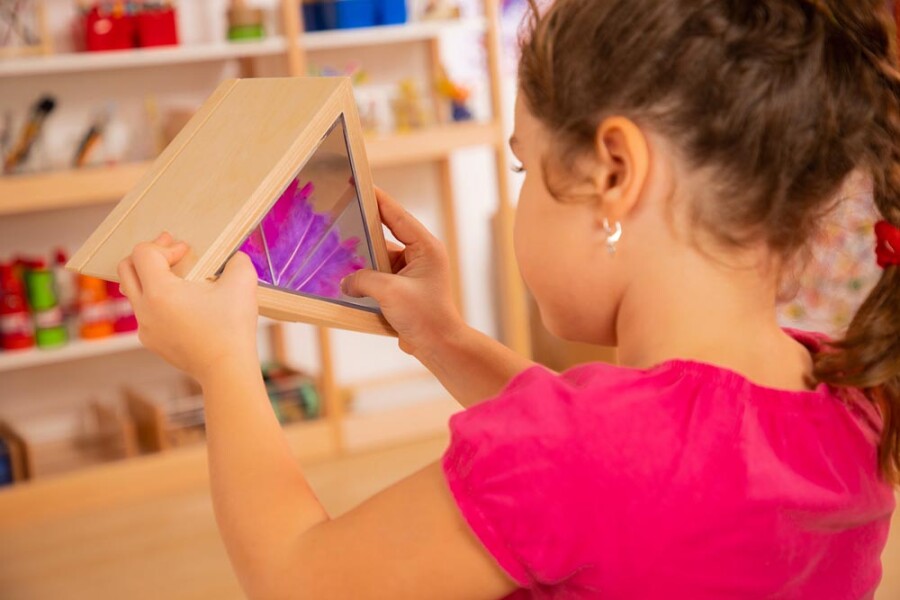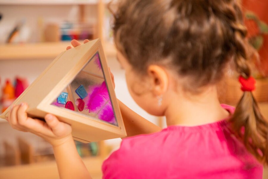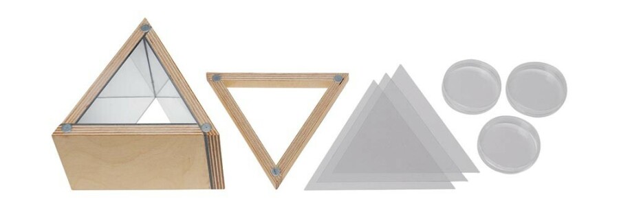 Nieuwe patronen en kleuren ontstaan hier door eigen experimenten. Stevige acrylspiegels en een magnetische lijst maken wisselen super eenvoudig. Vul de ronde bakjes met glitter, steentjes of olie-gel voor vloeiende effecten. Het doorzichtige driehoekvak kun je vullen met papier of natuurmateriaal. Zonder lijst wordt het een spiegeltent met schitterende symmetrieën. Past goed bij onderzoekend leren en rustige kijkmomenten.