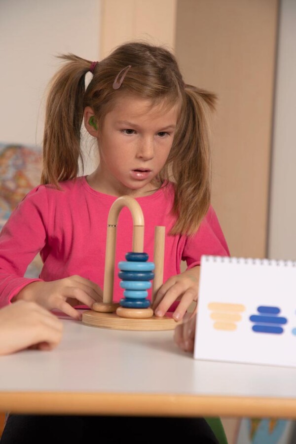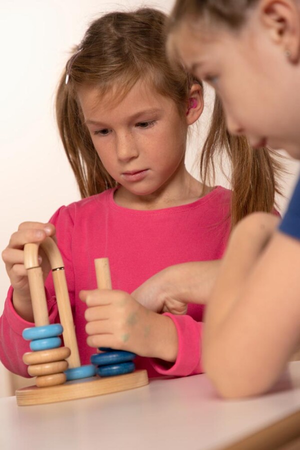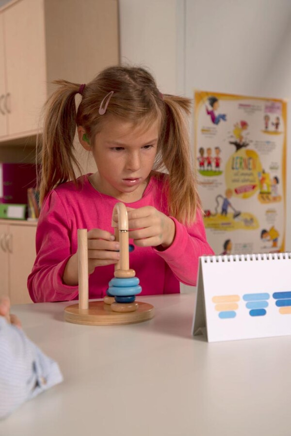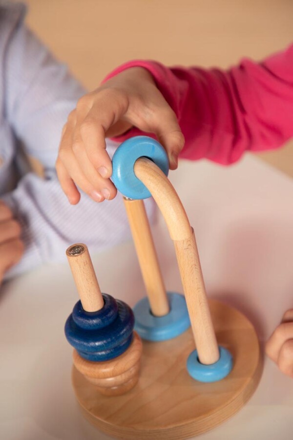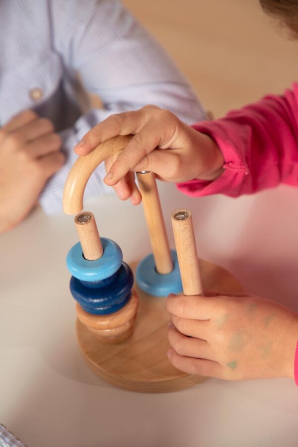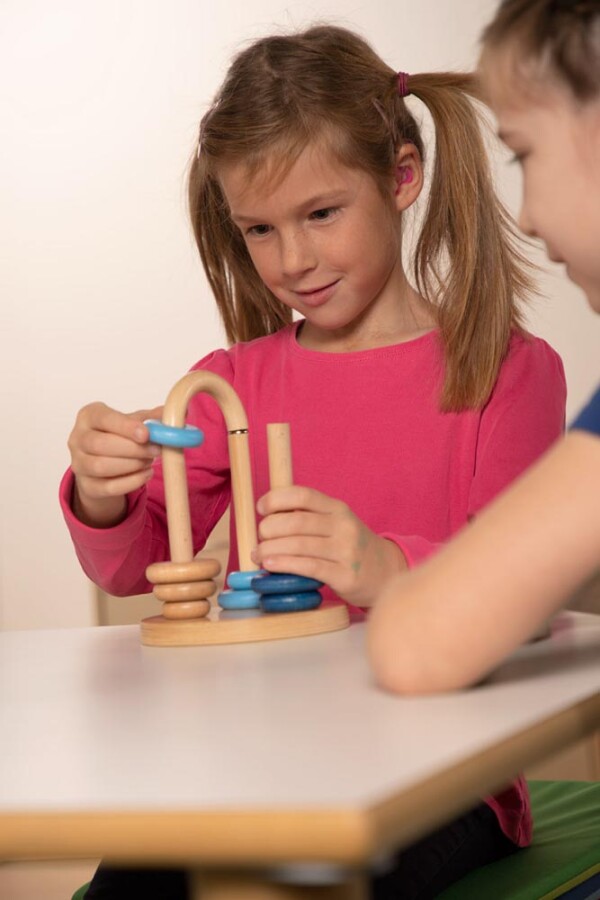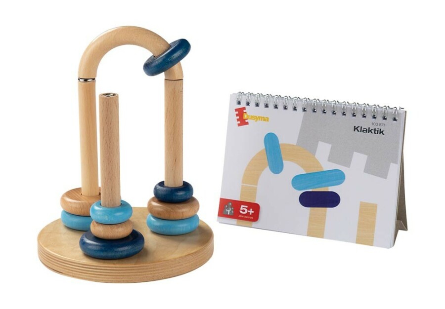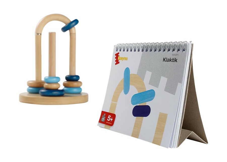 Drie dimensionaal denkwerk met ringen die alleen mogen schuiven, niet tillen. Elke opdracht vraagt plannen, omwegen en volhouden tot het patroon klopt. Is een opgave gelukt, dan wordt die positie het startpunt voor de volgende. Compact, stevig en aantrekkelijk op elke speeltafel.