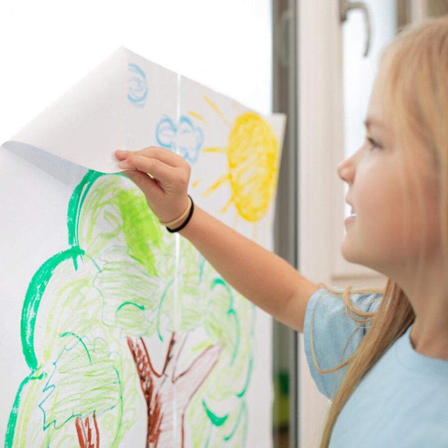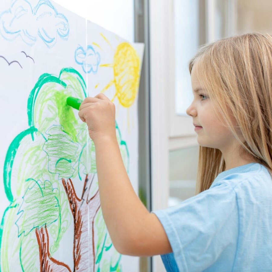 Dit zelfklevende tekenpapier blijft stevig zitten op glas, deuren en tafels, en laat geen resten achter. Ideaal voor groot werk, traceren bij het raam en zelfportretten op ware grootte. Kinderen knippen eenvoudig de gewenste lengte, plakken, tekenen en verplaatsen wanneer nodig. De lijmlaag is op waterbasis en oplosmiddelvrij, dus veilig in klas en opvang. Handig voorraadpakket voor een tekenhoek die uitnodigt tot proberen.