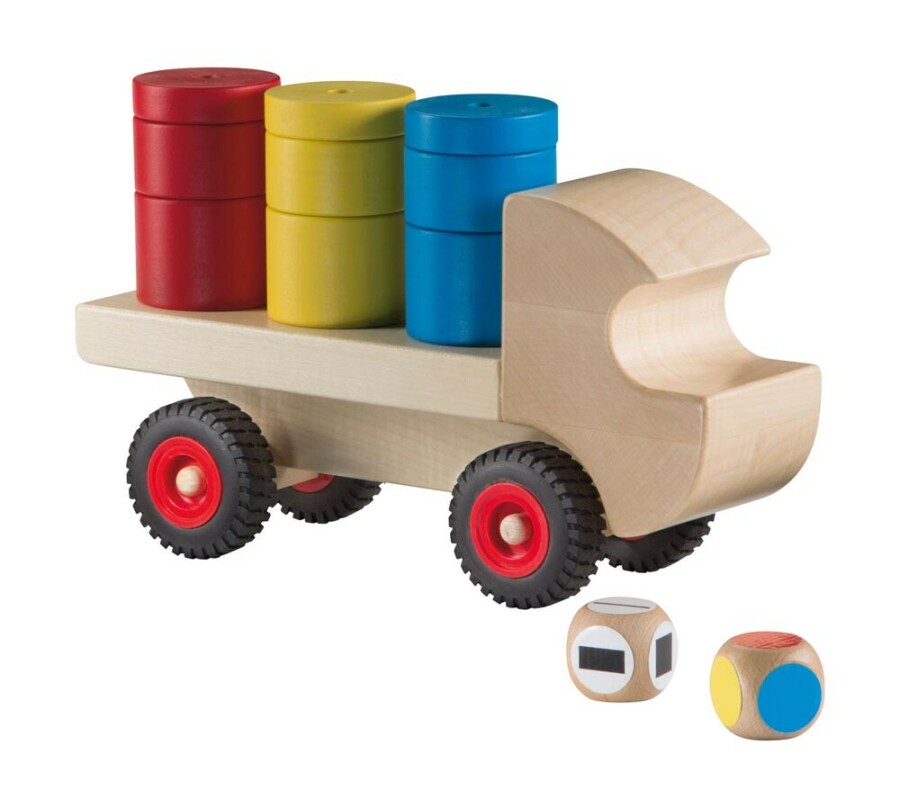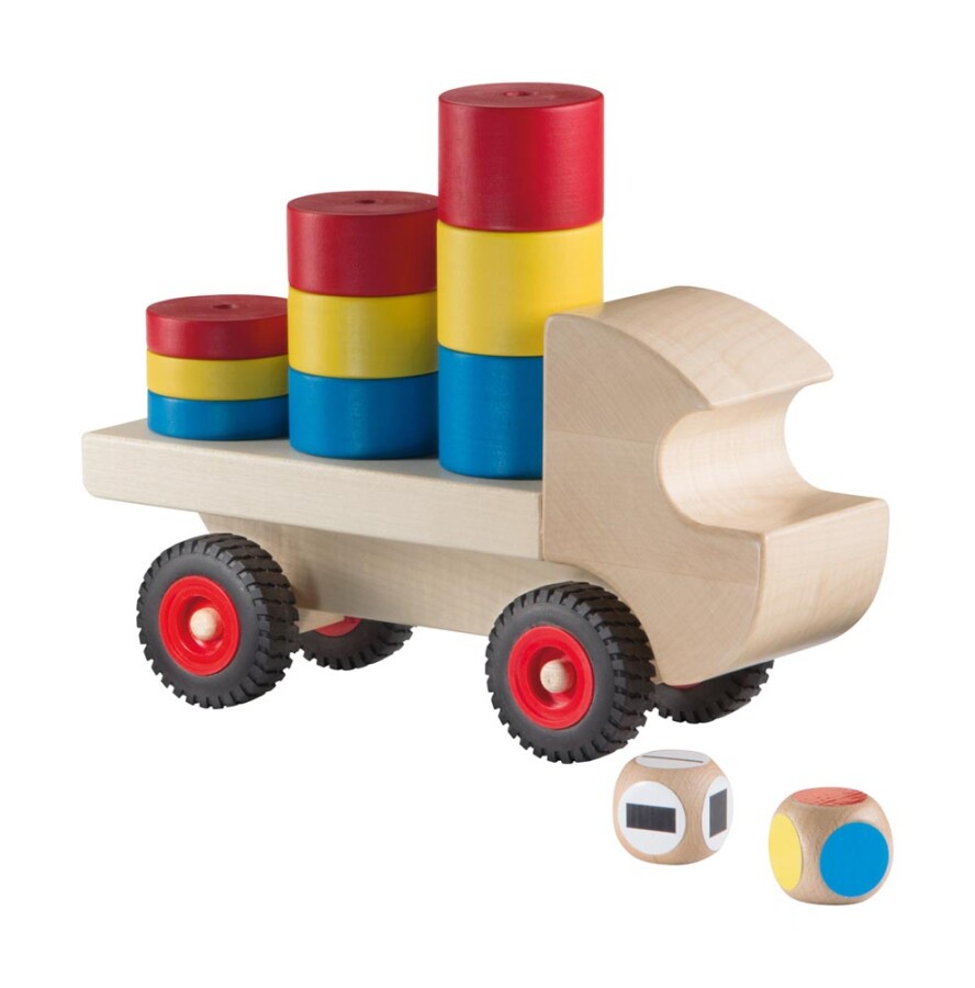 Combineer kleuren leren met rijden en laden in één houten vrachtwagen. Kinderen koppelen dobbelsteenbeelden aan de juiste schijf. Varieer met diktes en vormen voor extra uitdaging. Rijden, stapelen en sorteren versterken motoriek en concentratie. Speel alleen of samen in de speelhoek.