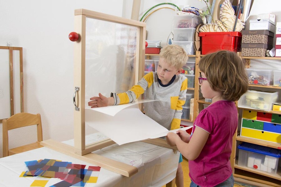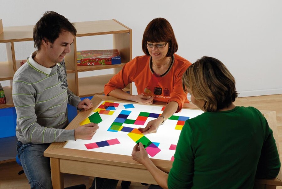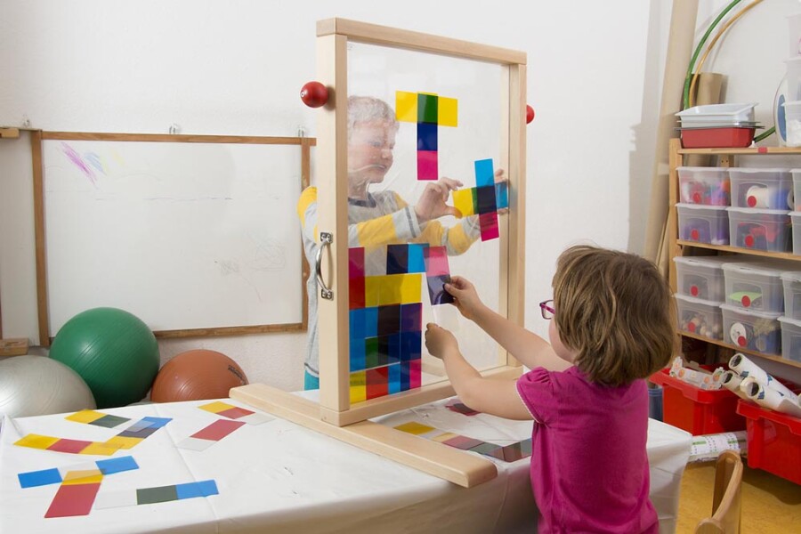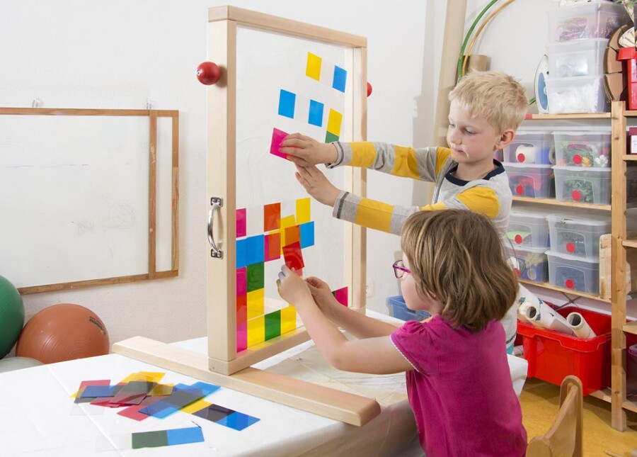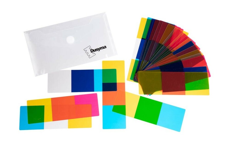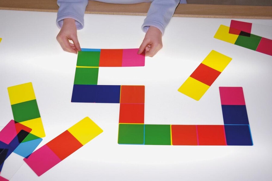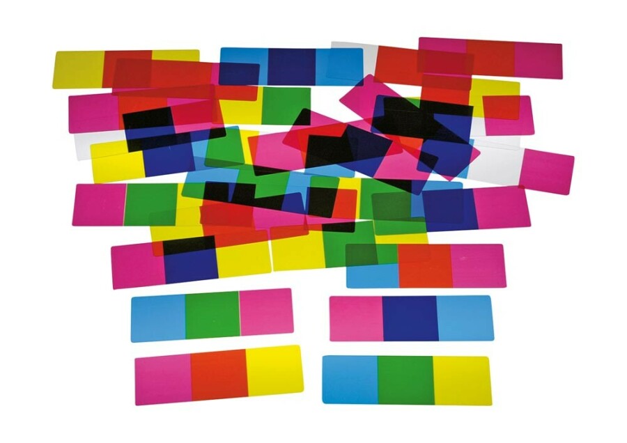 Kleur mengen wordt tastbaar met deze transparante kaarten. Leg basiskleuren over elkaar en zie nieuwe tinten ontstaan. Spelen kan als domino of vrij leggen. Werkt uitstekend op een lichttafel of voor een raam.