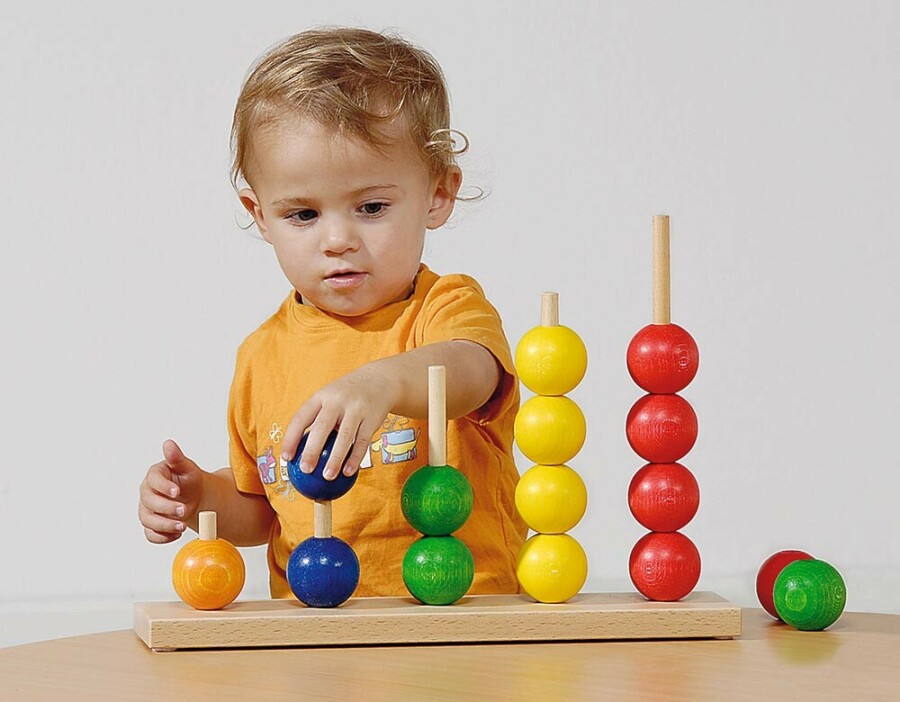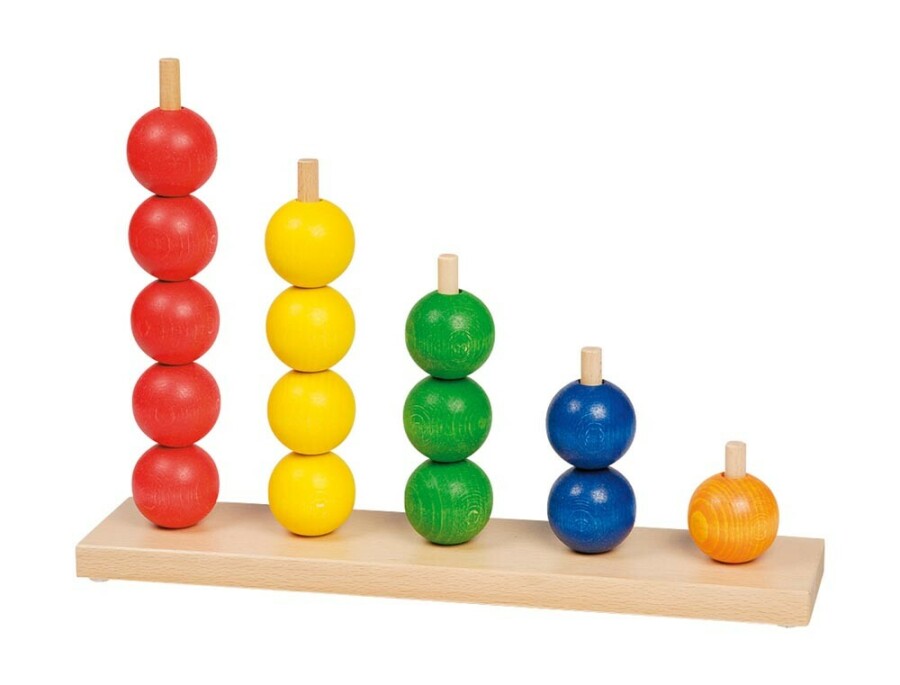 Stapelen, sorteren en tellen met kleurrijke houten ballen op staafjes van verschillende lengtes. Grote, goed grijpbare bollen stimuleren motoriek, kleurherkenning en logisch denken. Stevig bord houdt alles overzichtelijk op tafel of vloer. Perfect voor kleine groepen en begeleid spel.