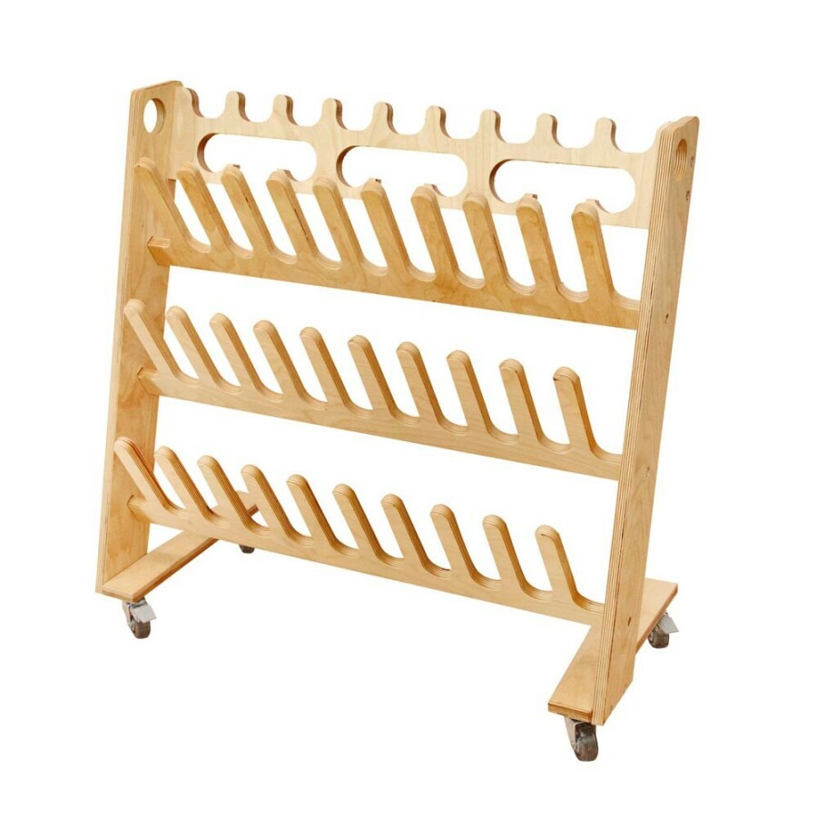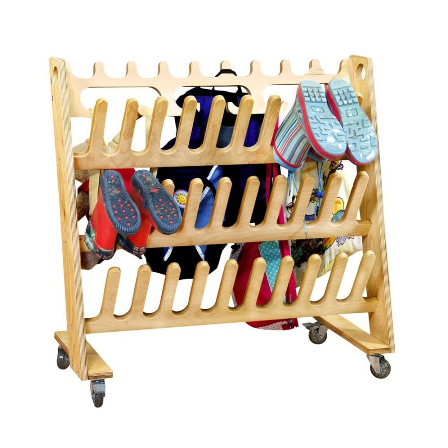 Deze verrijdbare kar houdt laarzen en tassen netjes bij elkaar en de vloer schoon. Kinderen hangen hun spullen per paar op, drogen snel en alles blijft vindbaar. Het stevige berken-multiplex past mooi in de entree en is eenvoudig te verplaatsen. Wordt geleverd als bouwpakket dat snel in elkaar zit.