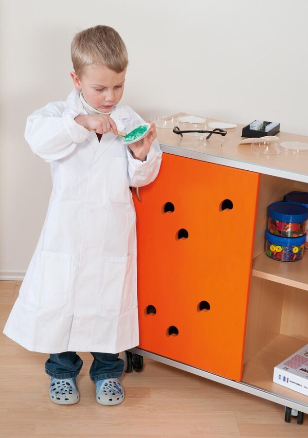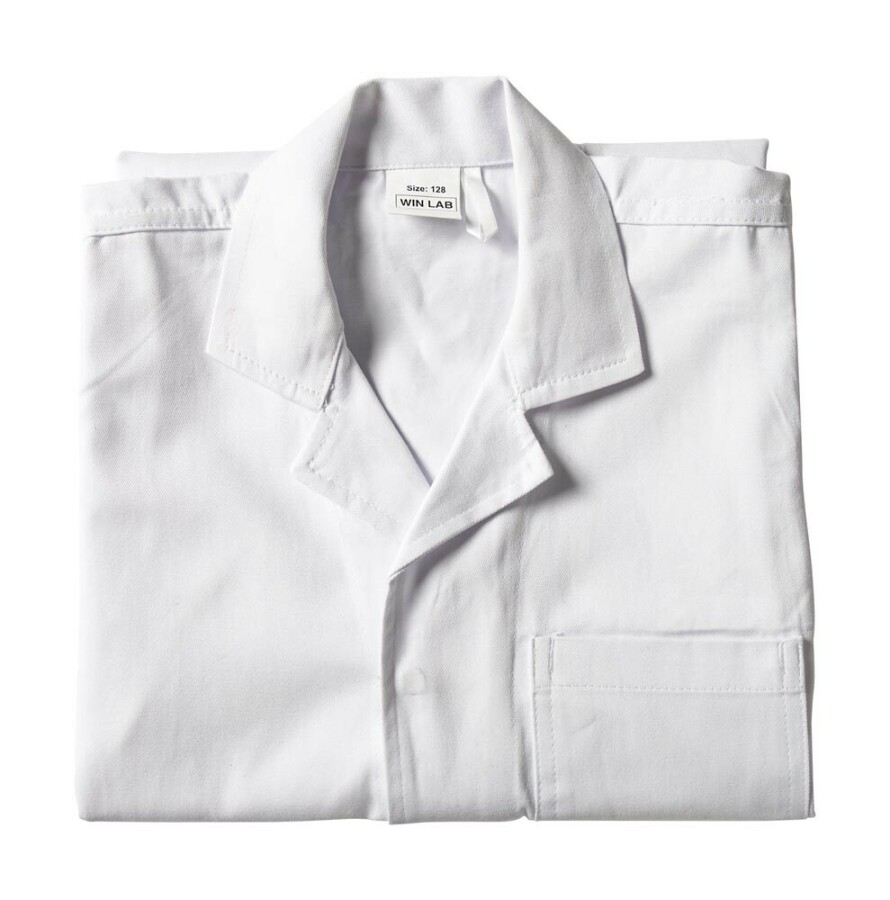 Kinderlabjas in maat 128 met een borstzak en twee zijzakken. Perfect voor proefjes, technieklessen en rollenspel. Gemaakt van ademend katoen en prettig om te dragen. Geeft elke jonge onderzoeker een professionele uitstraling.