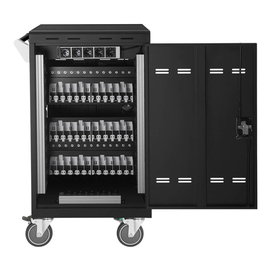 De geïntegreerde slimme laadmodule zorgt voor een gelijkmatige verdeling van de op te laden devices en voorkomt overladen. Tevens wordt door het gesegmenteerd opladen overspanning bij het opstarten voorkomen. De stevige stalen constructie en de solide 2-punts stalen vergrendeling houden uw tablets en laptops absoluut veilig.