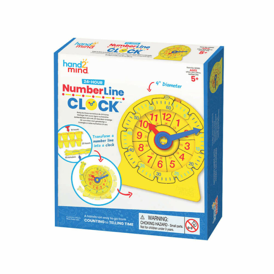 Met een uurwijzer van 1-12 en een 12- en 24-uurs getallenlijn kunnen kinderen de tijd fysiek omzetten naar een wijzerplaat. Dit helpt hen de relatie tussen een getallenlijn en een klok te begrijpen. De minutenwijzer is genummerd in intervallen van vijf minuten van 0-60.