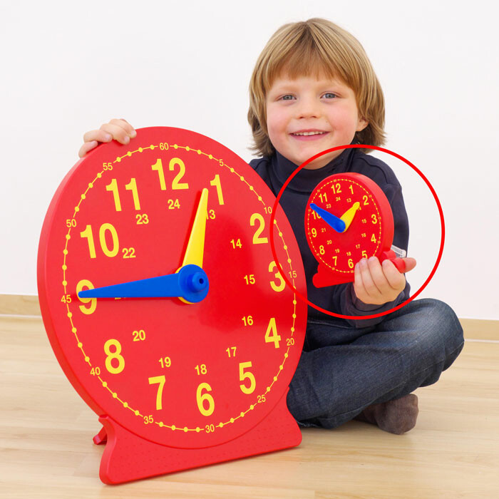Een 24-uurs leerlingenklokje waarvan de wijzers synchroon draaien. Draai je aan de grote wijzer draait de kleine wijzer automatisch mee. Het klokje is voorzien van een standaard en heeft een diameter van ongeveer 13 cm.