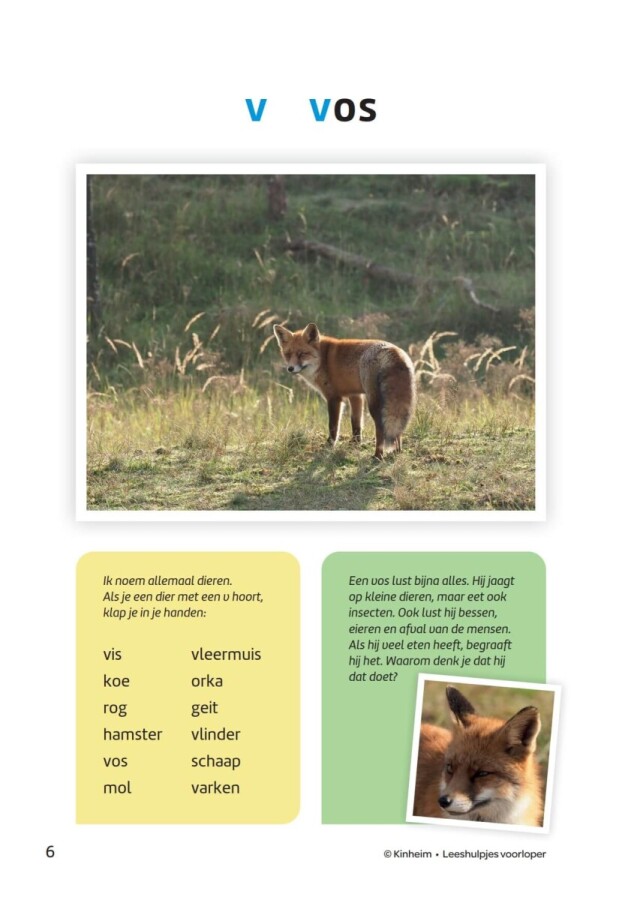 - Aan de hand van aansprekende dierenfoto’s, korte teksten en speelse opdrachten leren kinderen klanken onderscheiden en koppelen aan letters. Zo wordt een stevige basis gelegd voor het leren lezen in groep 3.