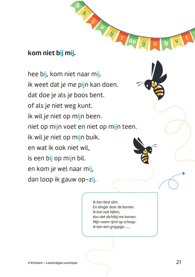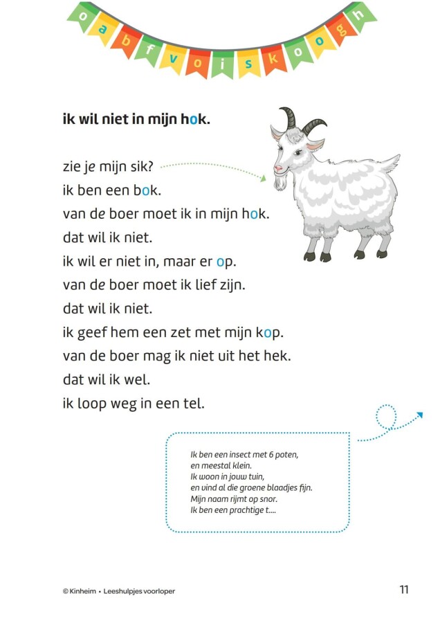 - Onderaan elke pagina staat een raadsel, gedichtje of rebus die vooruitblikt op de volgende bladzijde. Dit prikkelt nieuwsgierigheid en stimuleert interactie en taalgebruik. De opbouw zorgt voor succeservaringen en sluit naadloos aan bij de leerlijn beginnende geletterdheid.