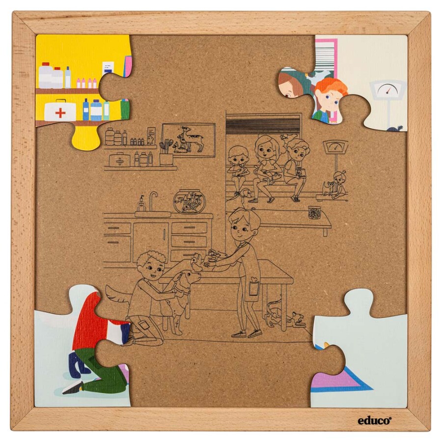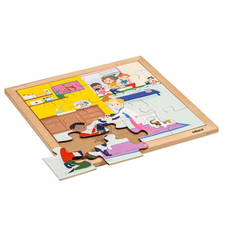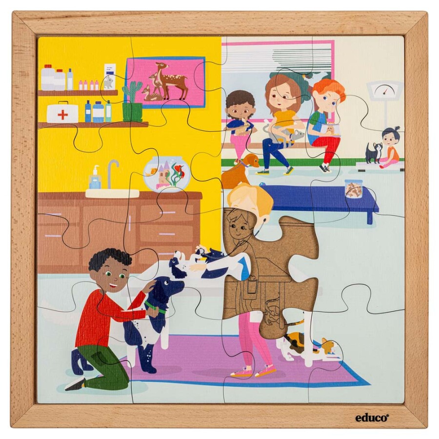 Ontdek hoe een dierenarts voor huisdieren zorgt met deze educatieve houten Legpuzzel Gezondheidszorg - Dierenarts. Kinderen leren spelenderwijs over onderzoek en behandeling van dieren, met herkenbare situaties uit de praktijk. Duurzaam, leerzaam en perfect voor jonge dierenvrienden.