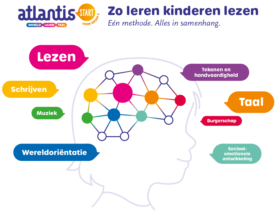 Atlantis Start is een methode voor geïntegreerd onderwijs. Verhalende en informatieve teksten vormen de brug naar andere vakken: kinderen ontdekken de wereld bij wereldoriëntatie, oefenen nieuwe woorden in schrijfopdrachten en verkennen burgerschap via herkenbare personages. De verbanden zijn al gelegd, zodat jij er direct mee aan de slag kunt.