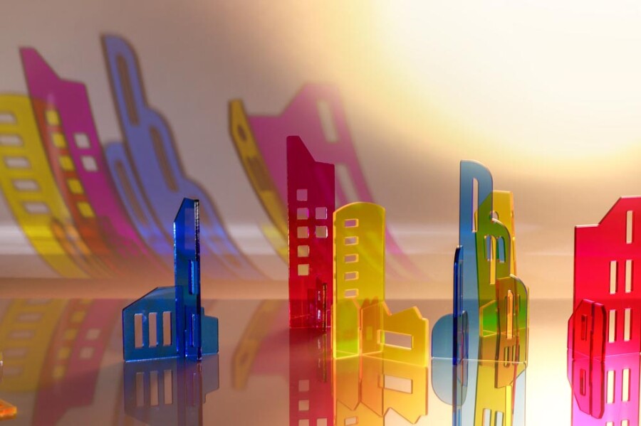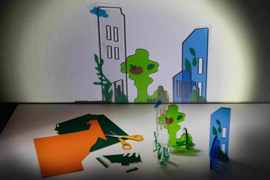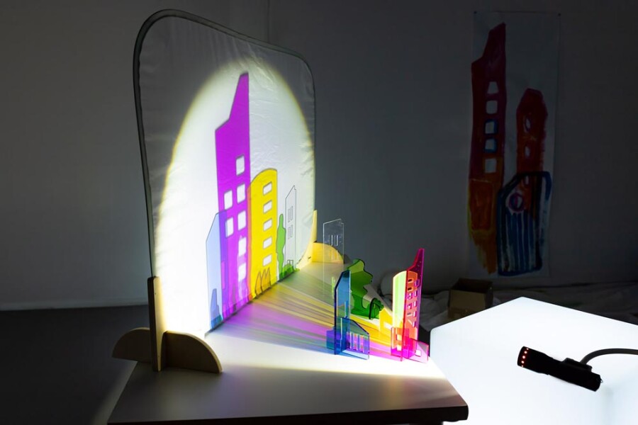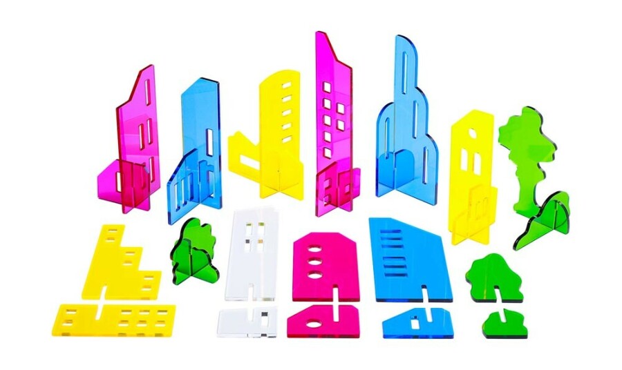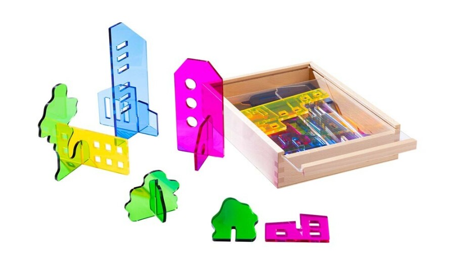 Kinderen raken gefascineerd door licht en schaduw en gaan meteen experimenteren. Verlicht de onderdelen en zie hoe gekleurde schaduwen ontstaan en mengen. Kleine huisjes worden op de muur een grote skyline. Boven- en onderstukken zijn onderling uitwisselbaar, dus elk bouwwerk krijgt een eigen karakter.