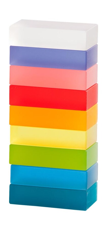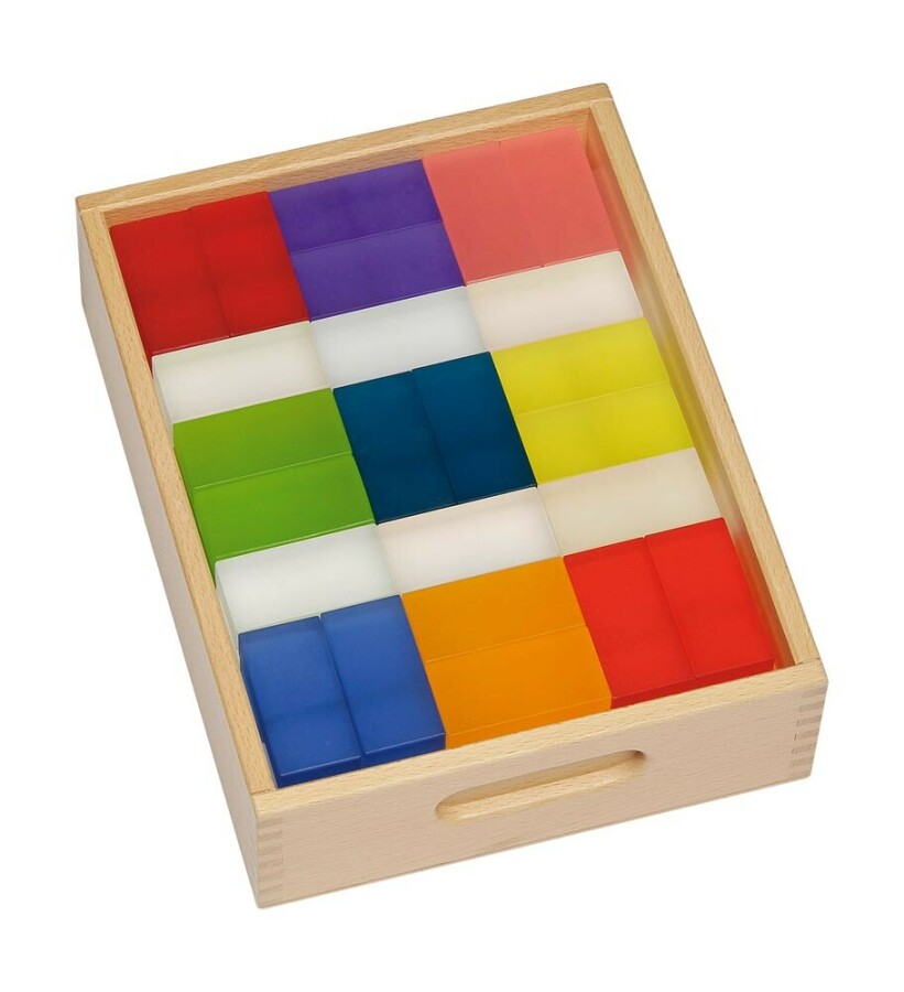 Transparant matte lichtblokken geven bouwwerken een betoverend kleurspel, afhankelijk van licht en achtergrond. Combineer met bekende Uhl-, sier- en juwelenblokken dankzij identieke maatvoering. Ideaal op lichttafel, vensterbank of bouwhoek. Inclusief stevige houten opbergkist.