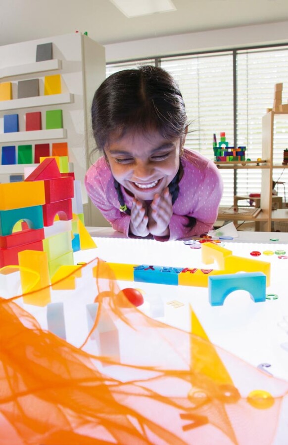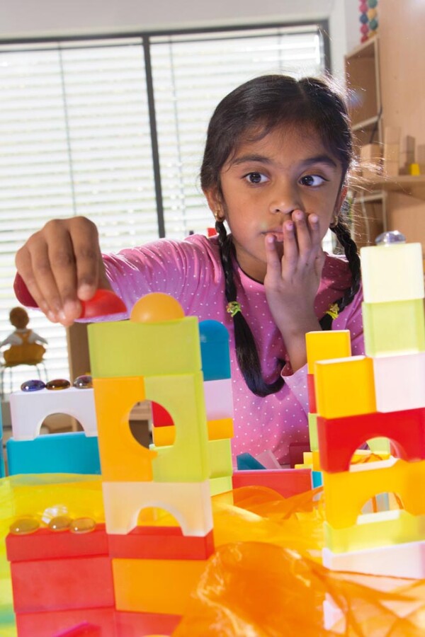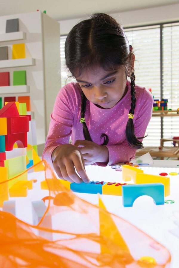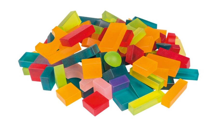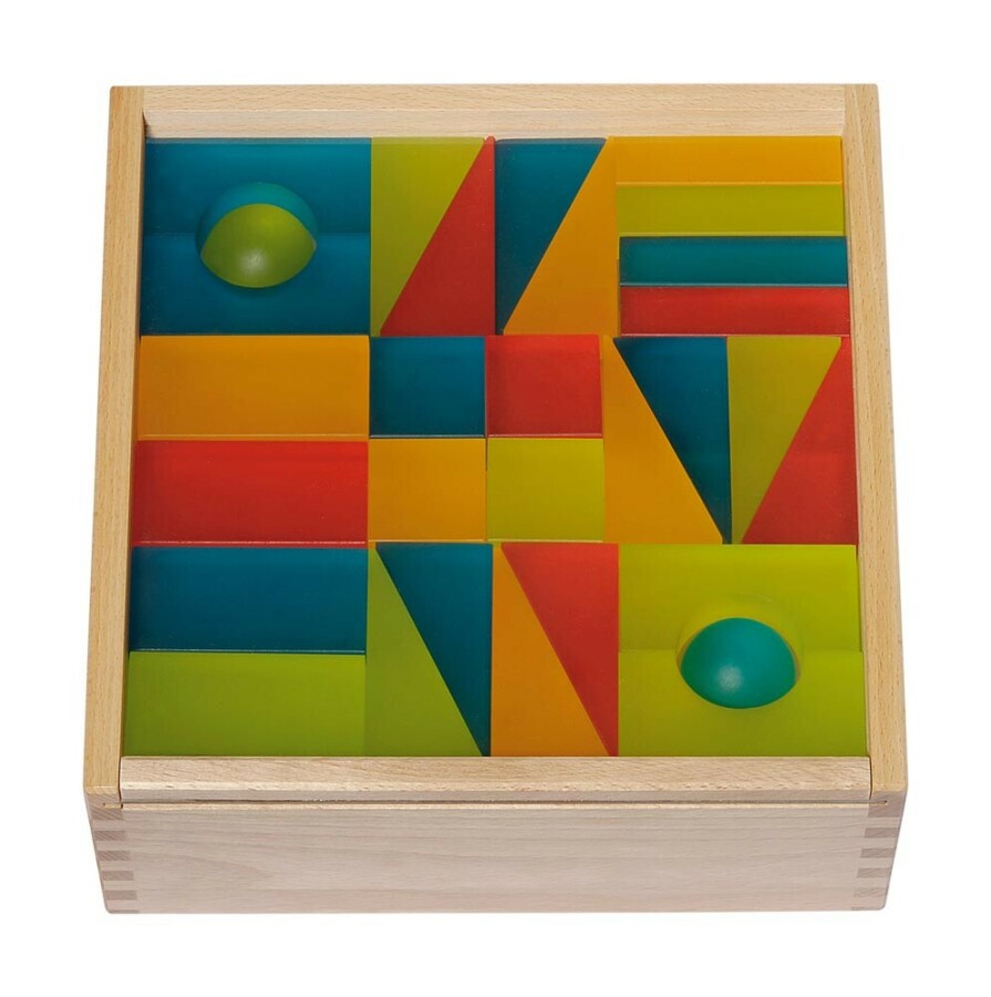 Matte, gekleurde acryblokken laten kinderen bouwen met licht en kleur, op tafel of lichtpaneel. Het materiaal is transparant met satijnen glans; kleuren veranderen subtiel met de lichtbron en achtergrond. Combineer ze dankzij de identieke maatvoering met bekende houten blokken voor nog rijkere bouwwerken. De stevige beuken kist dient ook als bouwvlak en beschermt de set. Ideaal voor vrij spel, kleuronderzoek en samenwerken in de klas of thuis.