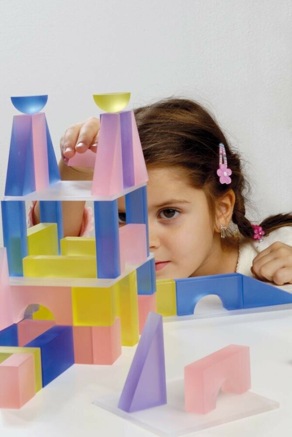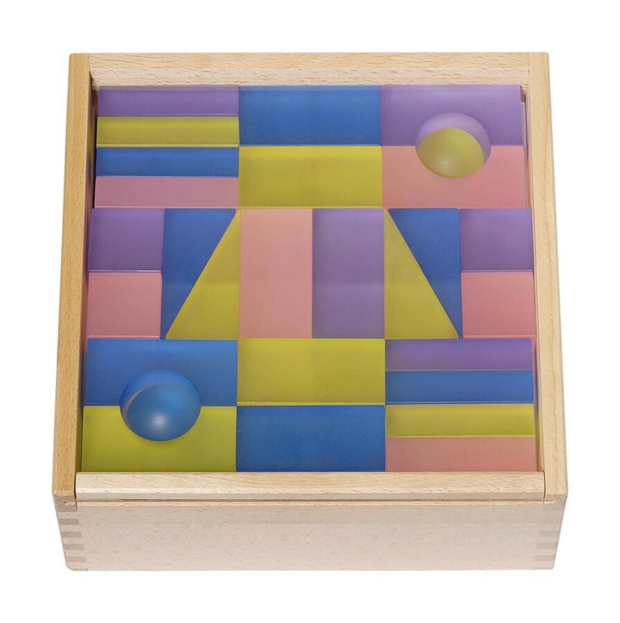 Matte acryl bouwstenen in zachte pasteltinten geven lichtspel en kleurmix een extra dimensie. Op de lichttafel zie je subtiele schakeringen en scherpe randen. Kinderen bouwen, sorteren en experimenteren met transparantie. Gebruik in de bouwhoek, bij onderzoekstafels of in sensorisch spel.