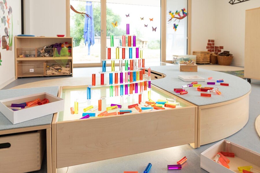 Transparante cilinders in zeven felle kleuren dagen uit om te sorteren, bouwen en steken. Op een steekbord of lichttafel ontstaan patronen en kleurmengingen. Combineer met houten blokken voor extra contrast en hoogte. Goed voor fijne motoriek en ruimtelijk inzicht.