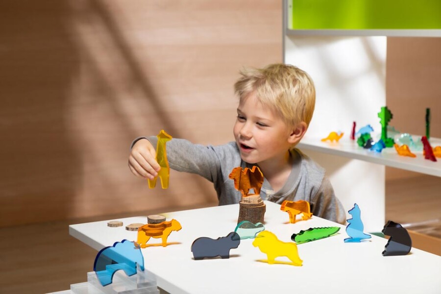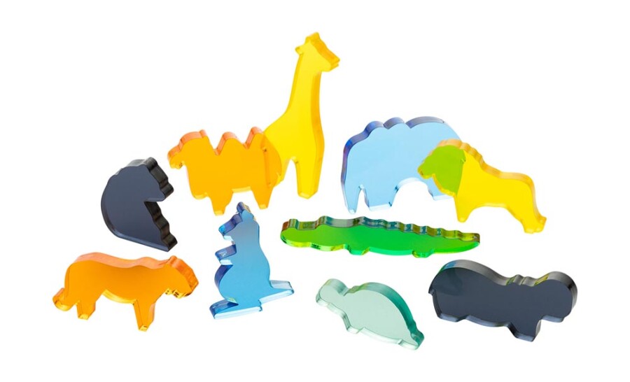 Transparante safaridieren van acryl brengen kleur en licht in rollenspel, sorteren en sensorisch spel. Ze voelen glad, zijn stevig en passen fijn in kleine handen. Combineer met natuurlijke materialen, lichttafel of houten figuren voor rijke verhalen en reken- of taalactiviteiten.