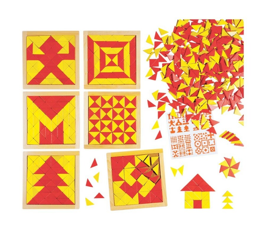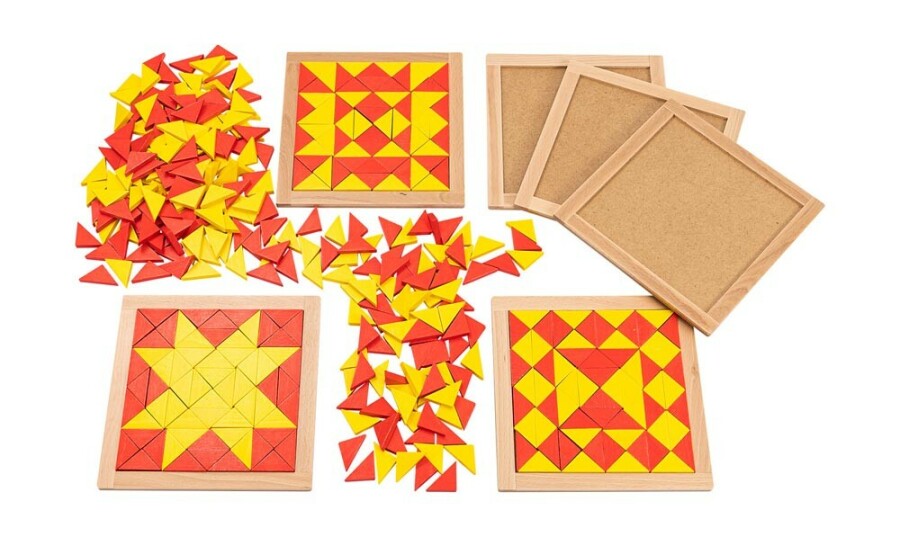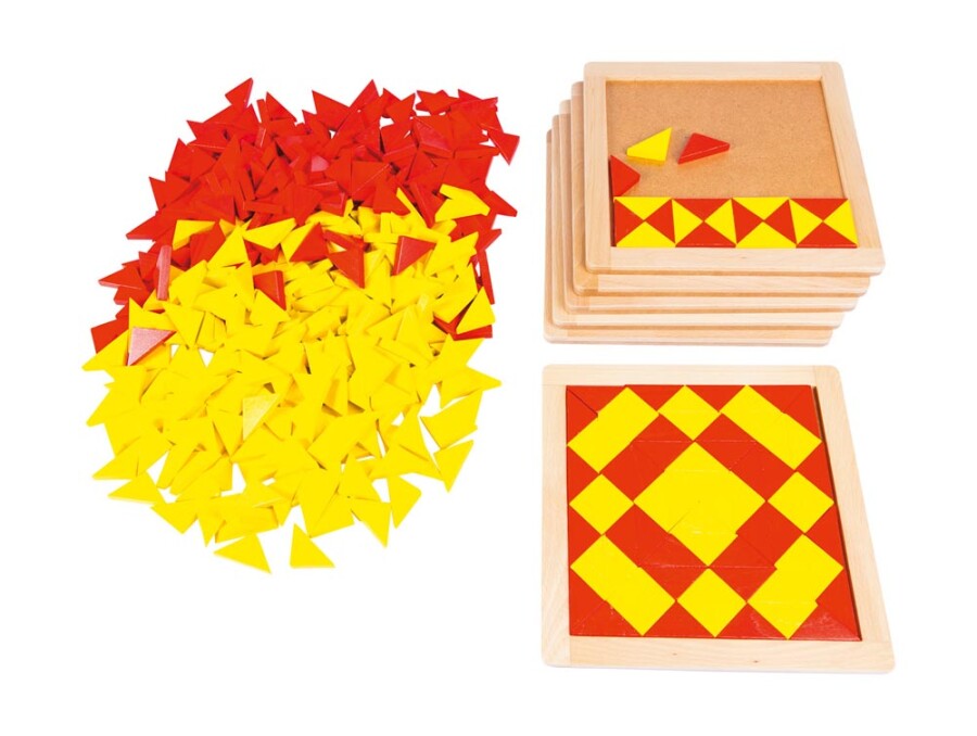 Start snel met patroonlegwerk in de klas. Kinderen vullen houten kaders met rode en gele driehoeken volgens voorbeelden. Het moeilijkheidsniveau bouw je rustig op, van herkenbare vormen tot complexe patronen. Ideaal voor ruimtelijk inzicht, kleurherkenning en samenwerken aan tafel.