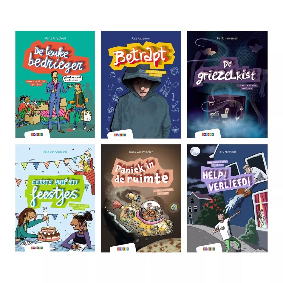 Pakket met zes verschillende leesboeken op AVI M5 in de serie ‘Makkelijk & Leuk’.