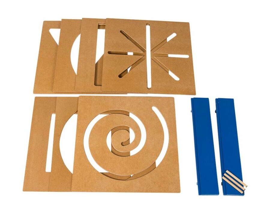 Laat kinderen symmetrische patronen ontwerpen in de zandbak met duidelijke sjablonen en handige stiften. Door vormen te voelen, te volgen en te combineren, groeien ruimtelijk inzicht en fijne motoriek. De meegeleverde strips maken een vierkante werkruimte. Versieren met natuurlijke materialen geeft extra effect.