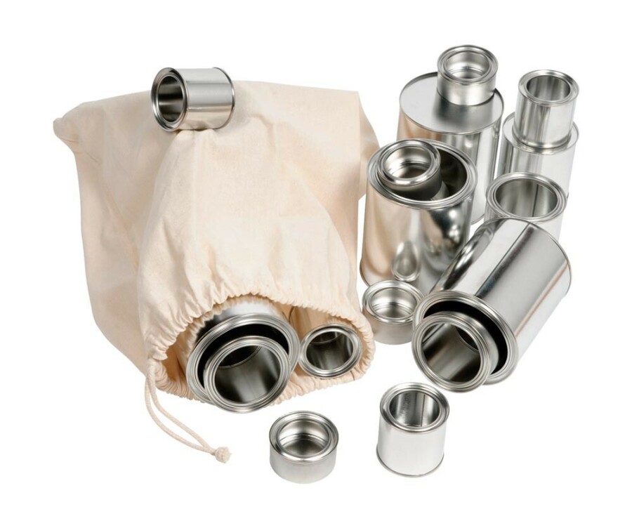 Metalen blikjes prikkelen zintuigen en nieuwsgierigheid: voelen, vergelijken, stapelen, vullen, luisteren naar klanken. Perfect voor heuristisch spel, losse onderdelen en onderzoek in de peuter- en kleutergroep. De stevige katoenen zak maakt opruimen en meenemen eenvoudig.