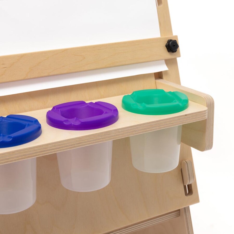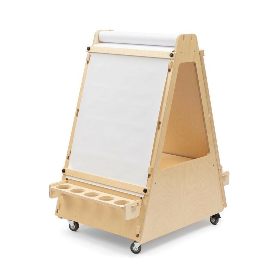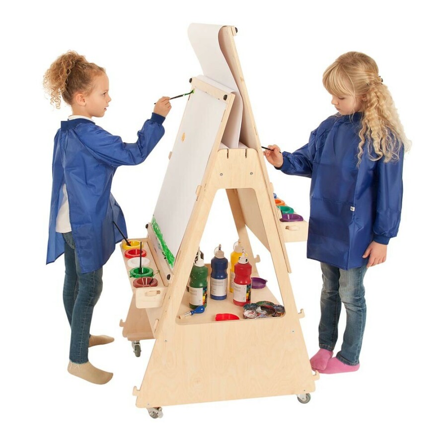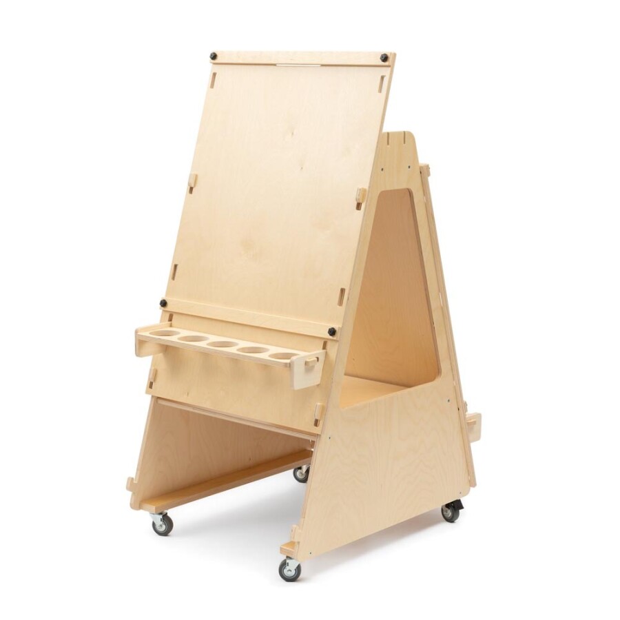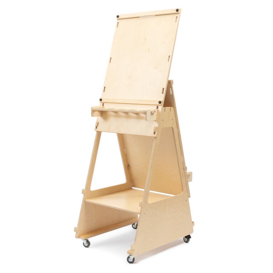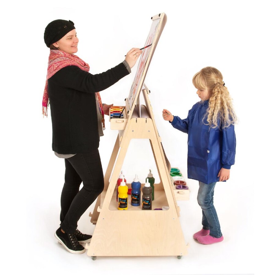 Schilder waar je wilt, zonder tillen: deze verrijdbare ezel heeft twee verstelbare werkvlakken. Ieder bord pas je eenvoudig aan de lengte van kind of volwassene. Papier rolt soepel van de houder en klem je stevig vast. Houders voor morsbestendige bekers houden verf en water op hun plek. De 360° zwenkwielen rollen licht en zijn met een voetrem te blokkeren. Gemaakt van sterk, glad afgewerkt berkenmultiplex uit Europa.
