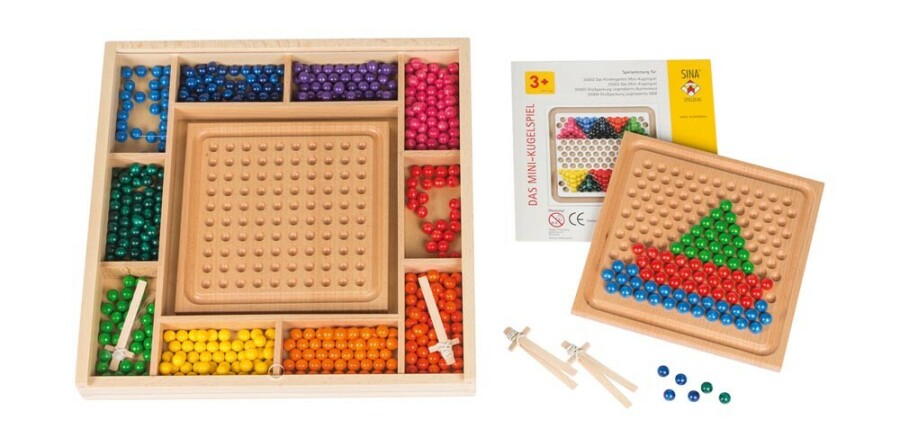 Dit rustige legspel traint pincetgreep, concentratie en patroonherkenning. Kinderen leggen rijen of mozaïeken met gekleurde houten balletjes. Beide legborden hebben twee zijden: in rijen of versprongen. Speel samen of alleen, met pincetten voor extra uitdaging.