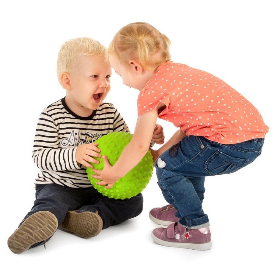 Deze zachte noppenbal nodigt uit tot rollen, vangen en rustig masseren van handen en armen. Met meer of minder lucht bepaal je zelf de veerkracht. De fluweelzachte buitenkant voelt prettig en geeft veel grip. De noppen stimuleren tastzin en doorbloeding op een speelse manier. Handig voor gym, spelrondes en sensorische momenten.