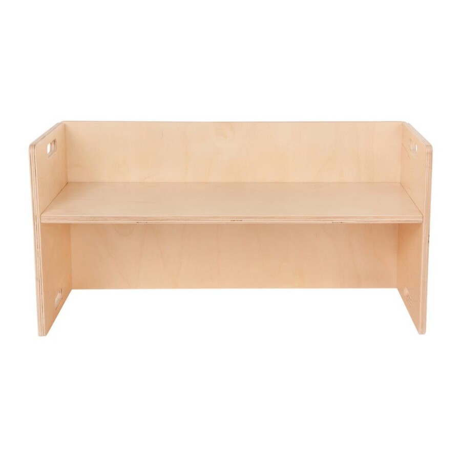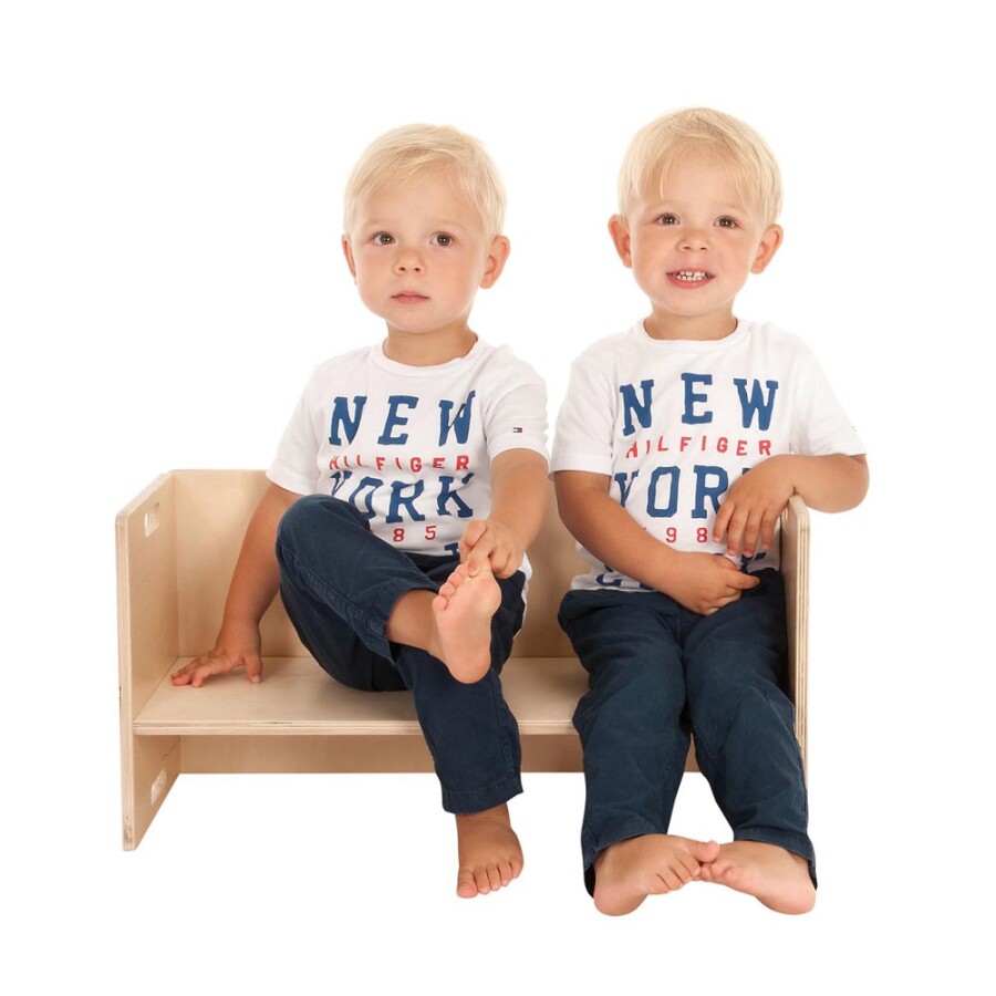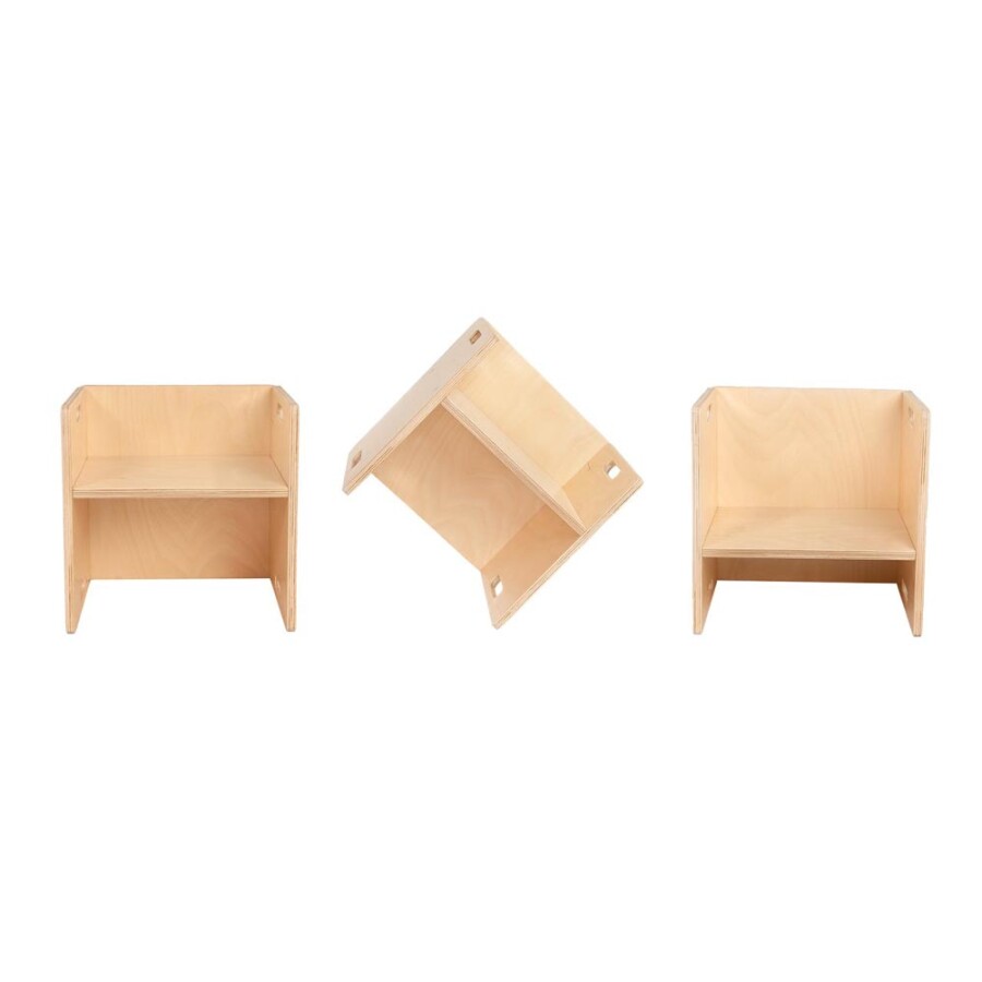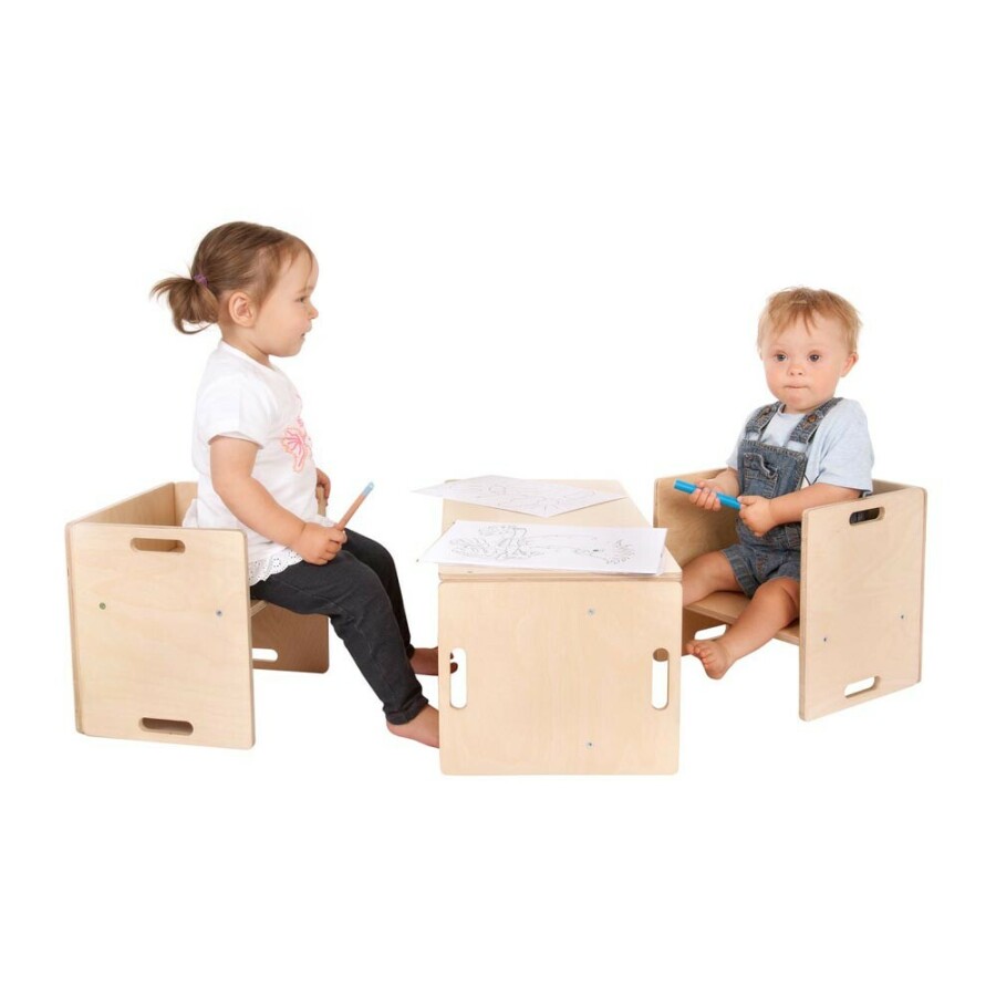 Deze stevige set geeft peuters een veilige zitplek en jou flexibiliteit bij activiteiten. Door te draaien kies je drie hoogtes, met of zonder armsteunen. Zo gebruik je een element als stoel of als laag tafeltje. De afgeronde randen en handgrepen voelen vertrouwd voor jonge kinderen. Duurzaam berkenmultiplex kan tegen een stootje en is eenvoudig schoon te maken.