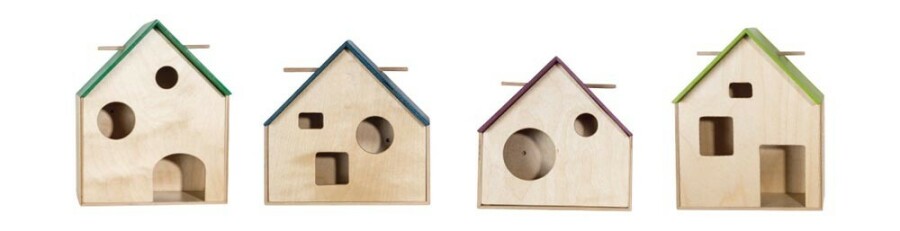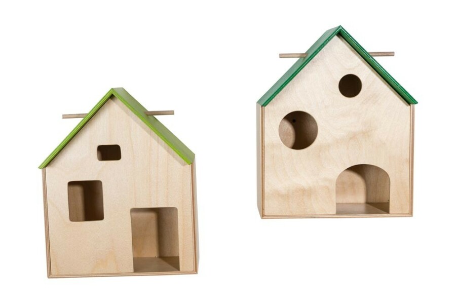 Deze huisjes geven thema’s en schatten een eigen plek in de klas of thuis. Door de verschillende kijkgaten verandert het perspectief steeds, wat nieuwsgierigheid prikkelt. De magnetische fronten haal je er zo af en combineer je binnen dezelfde maat. Met het houten stokje hang je iets voor het raampje. Stevig en decoratief in elk seizoen.