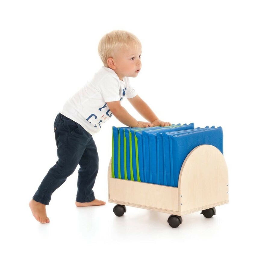 Na de kring schuif je alle zitkussens zo samen op deze compacte, verrijdbare wagen. De afgeronde houten basis beschermt kleine handen. Vier zwenkwielen met rem zorgen voor soepel en veilig verplaatsen. Opruimen wordt overzichtelijk en kinderen kunnen eenvoudig helpen.