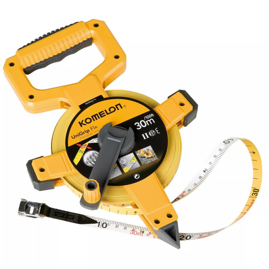 Slagvast, met kunststof beklede stalen cassette. Onverslijtbare glasfiberband centimetermaatverdeling. Door middel van een uitklapbare slinger is de band zeer snel op te winden.