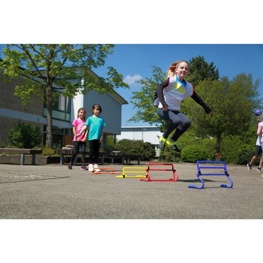 De opvouwbare trainingshordes zijn ideaal voor sportactiviteiten op school. Met deze hordes kun je eenvoudig verschillende parcoursen opzetten, perfect om de motoriek en coördinatie van kinderen te verbeteren. Ze zijn verstelbaar in vier hoogtes (15, 23, 30 en 37 cm), wat betekent dat je de moeilijkheidsgraad kunt aanpassen aan de leeftijd en het niveau van de kinderen. Deze set bestaat uit vier hordes in vrolijke kleuren: geel, rood, blauw en oranje.