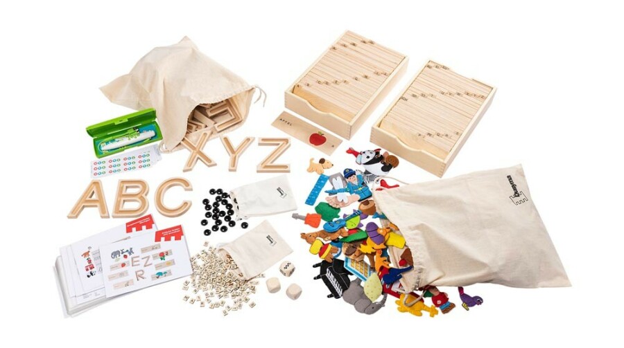 - 147 stoffen figuren en 147 woord-beeldkaarten van hout (7 x 21 cm)