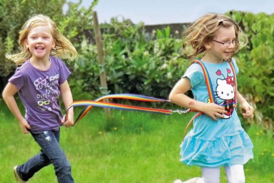 Een vrolijk regenboogtuigje waarmee kinderen veilig hun hobbel- of stokpaard kunnen meenemen. Je trekt het aan als een jasje en sluit het met een gesp bij de buik. De omvang is makkelijk verstelbaar, zodat het goed past bij verschillende maten. Vier bevestigingsringen geven keuze waar je de riem vastmaakt, handig tijdens spellen en optochten. Met een totale lengte van 190 cm is er genoeg bewegingsvrijheid; de schouderband is ongeveer 60 cm. Het materiaal is wasbaar, zodat vlekken snel weggaan en het tuigje lang mooi blijft.