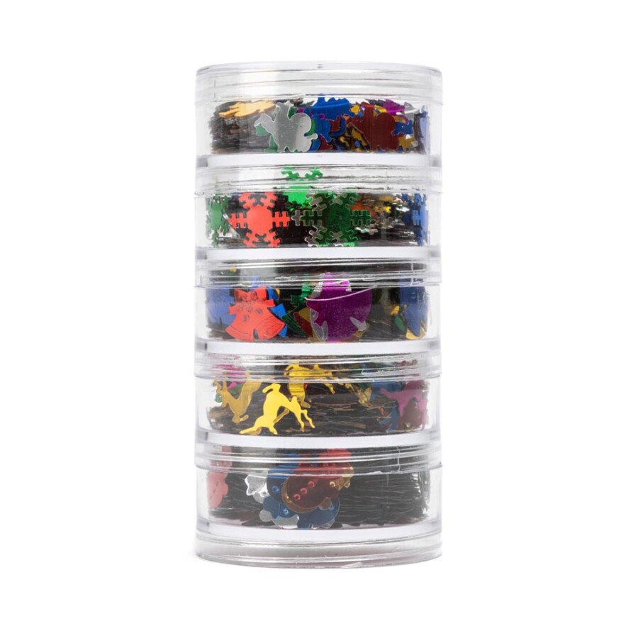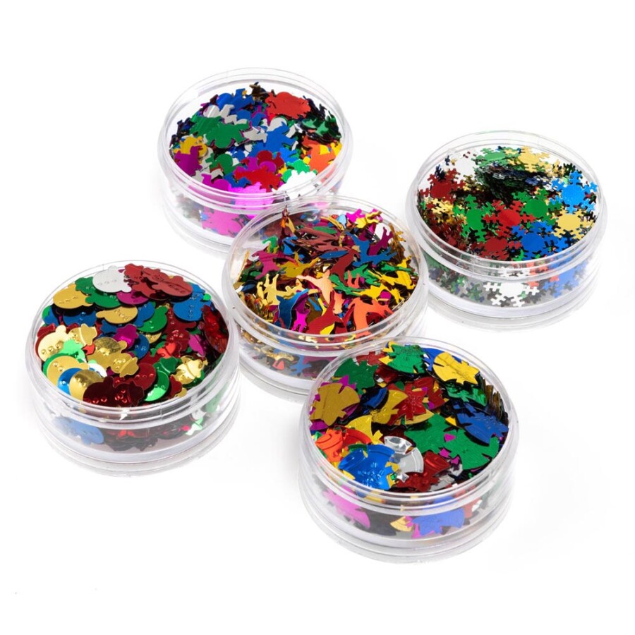 Geef kerstknutsels een glanzende finish met deze mix van gladde pailletten. De figuren zijn klaar voor kaarten, slingers, cadeaus en elk creatief idee. Alles is overzichtelijk gesorteerd in een doorzichtige doos met vijf vakken. Draai het deksel open en je kunt direct aan de slag.