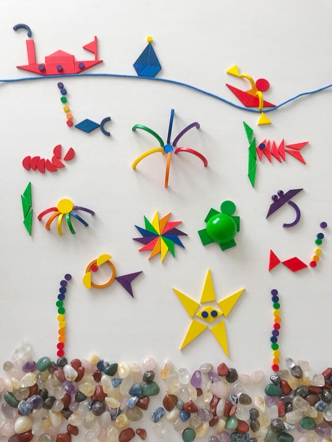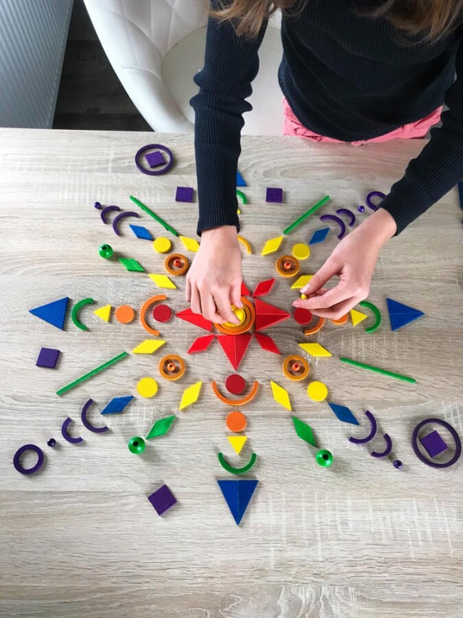 Met veel materiaal tegelijk leg je kleurrijke patronen en mandala’s met duidelijke voorbeelden. Klassieke vormen uit de kleuterpedagogiek trainen concentratie, wiskundetaal en samenwerking. De set is groot genoeg voor meerdere kinderen tegelijk.
