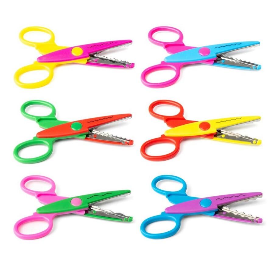 De zes varianten snijden zigzag, golfjes en sierlijke patronen, ideaal voor klas en thuis.