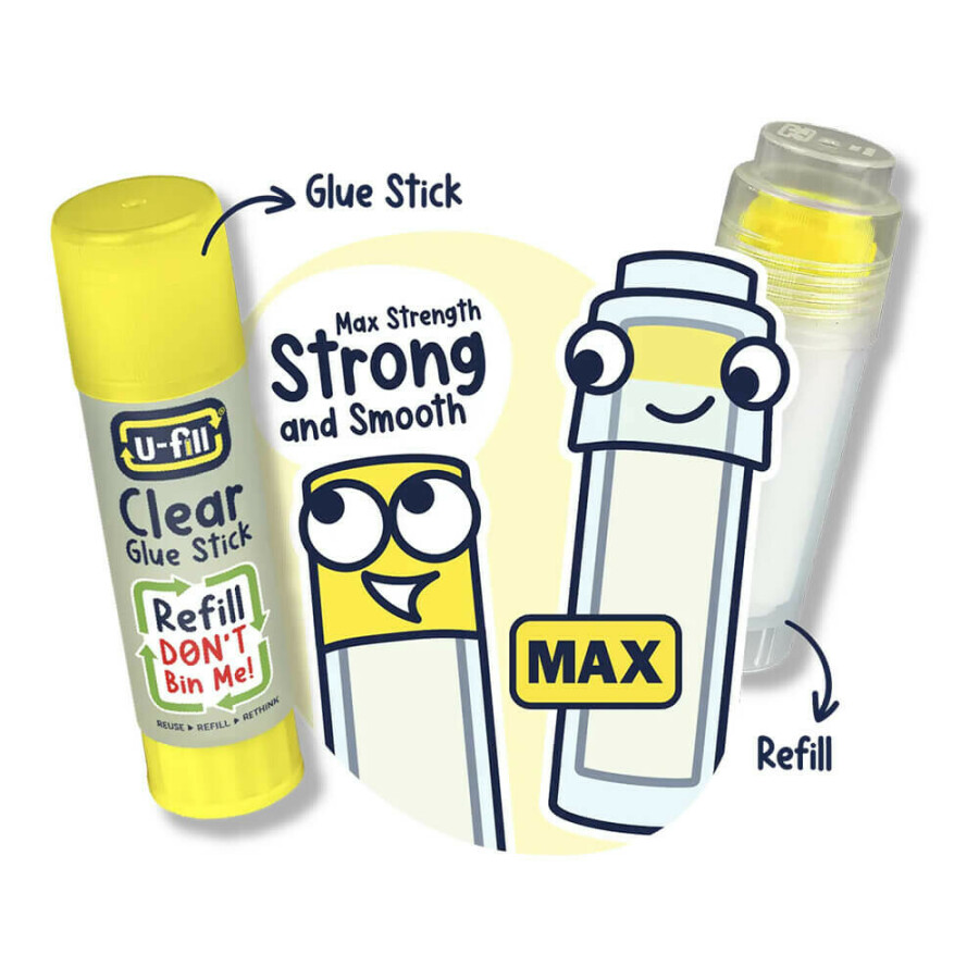 Met U-fill Plakstiften Geel plak je snel, krachtig en milieuvriendelijk, terwijl je bijdraagt aan duurzaamheid door hergebruik van navullingen.
