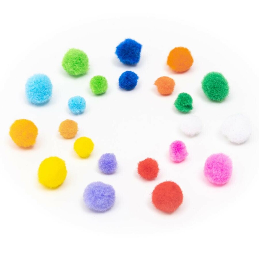 Dit ruime setje bevat 500 zachte pompons in twee maten, perfect voor knutselprojecten in klas en thuis. Met elf vrolijke kleuren versier je kaarten, maakt figuren of vult collages. Het lichte polypropyleen plakt makkelijk en houdt vorm. Handig opgeborgen in een hersluitbare zak, dus snel weer opgeruimd.